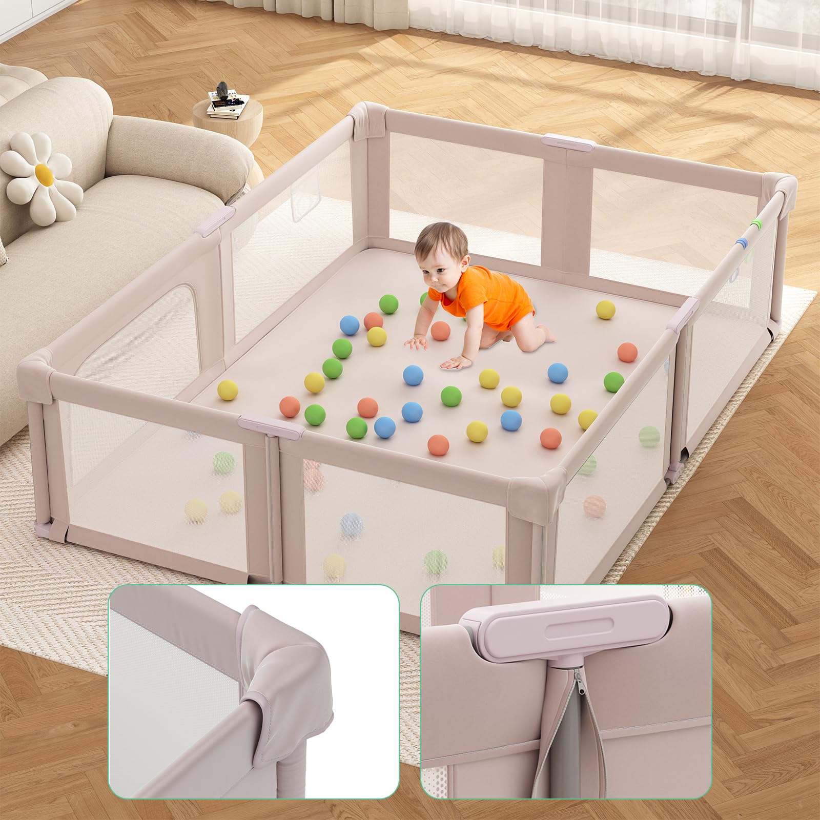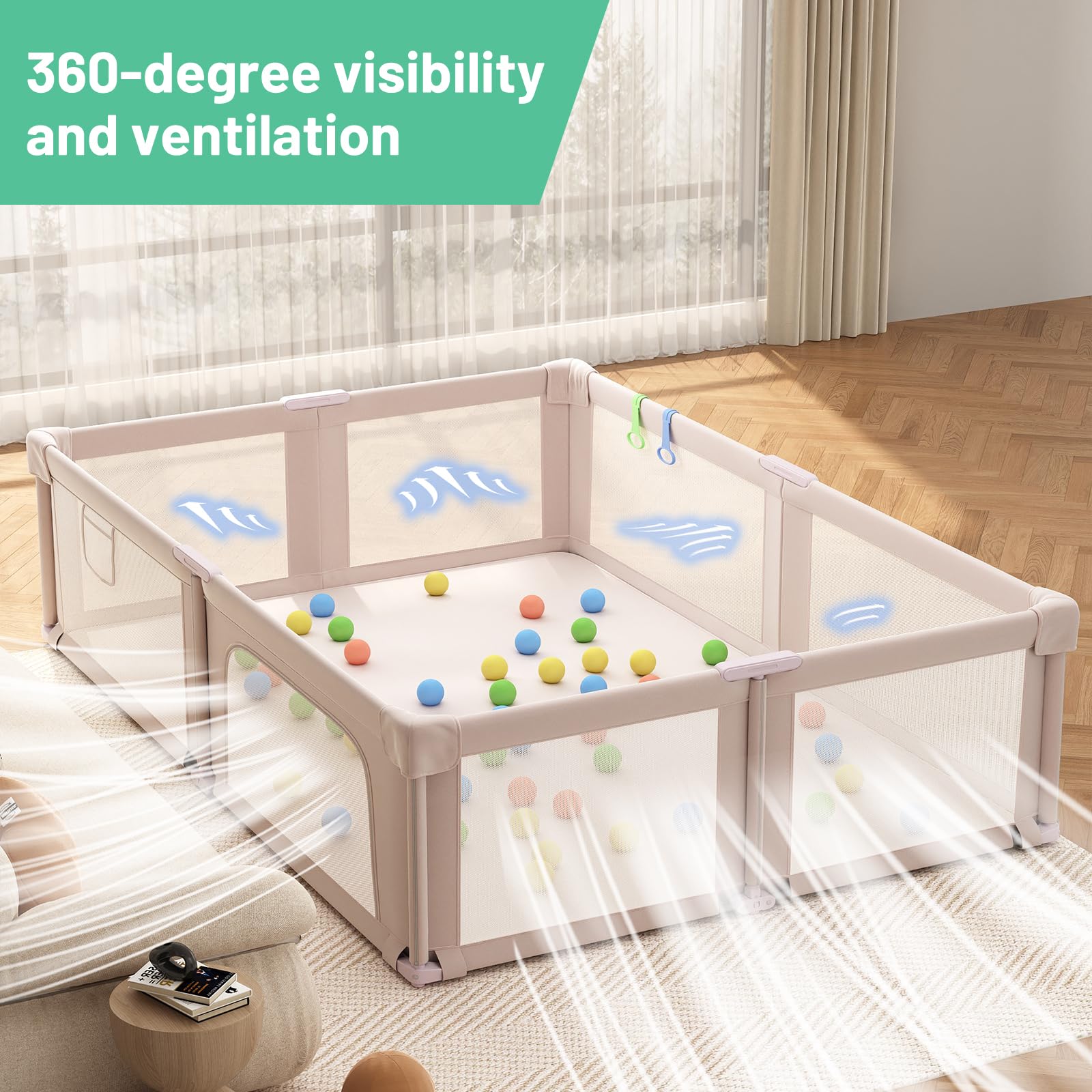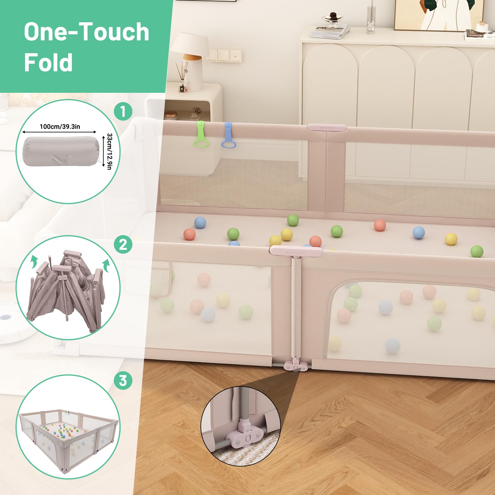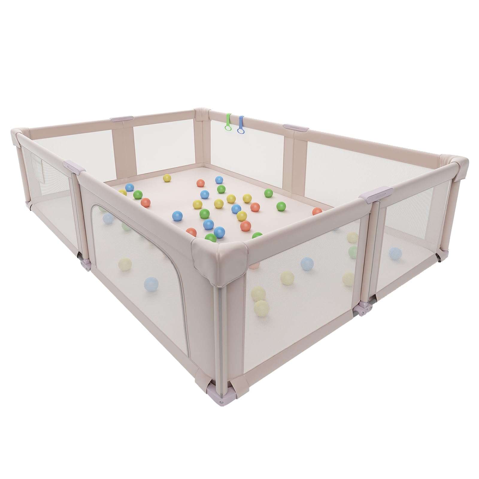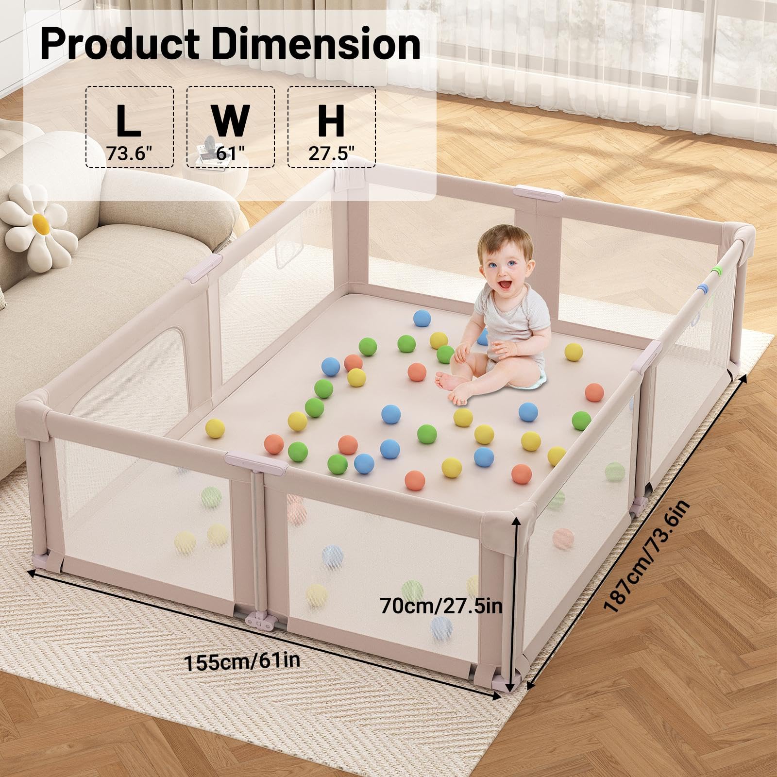 Large Safe & Sturdy Baby Playpen: This 73"x61" playpen is roomy enough for 2-3 toddlers to play together. It gives plenty of space for crawling, standing, and exploring, helping babies learn about the world. With two built-in pull rings and 50 colorful ball pit balls, it turns playtime into fun skill-buildingβboosting movement and hand-eye coordination while they play