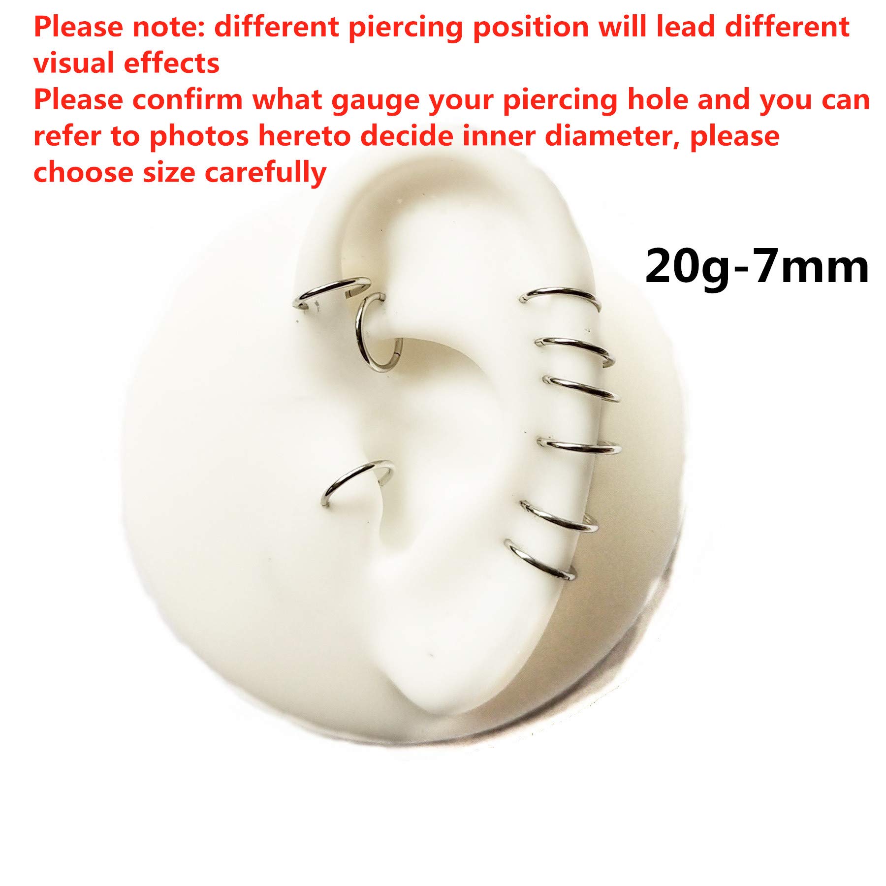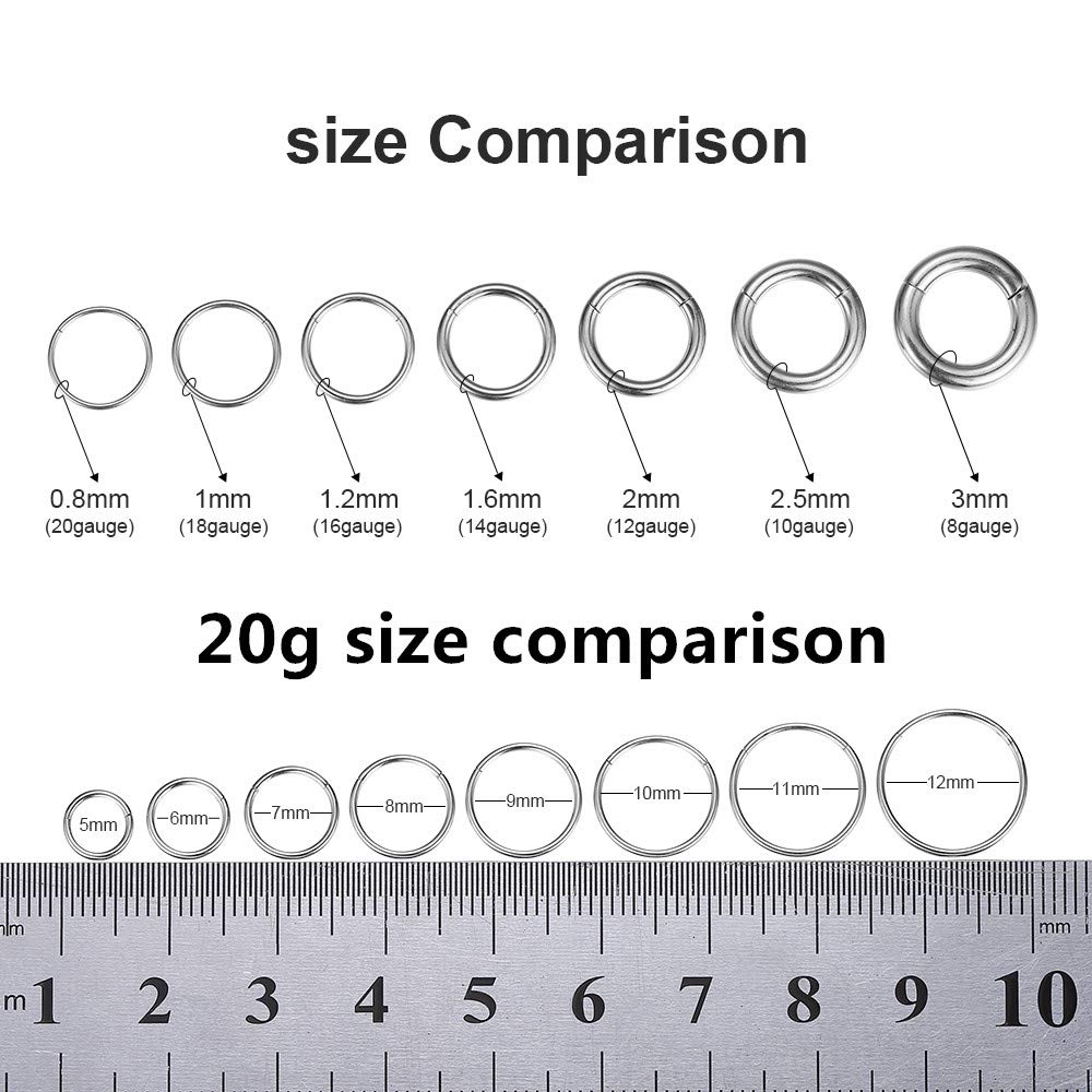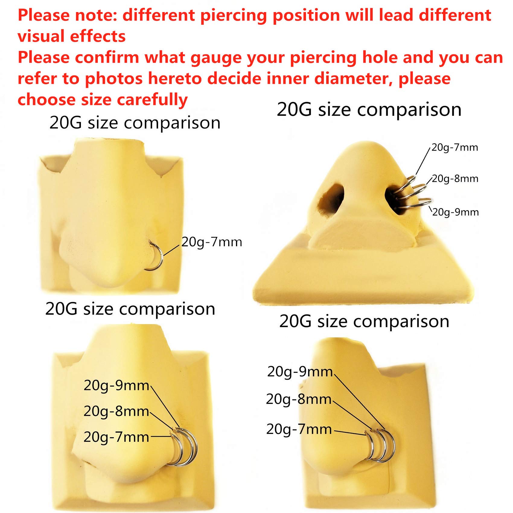 Sold individually Nose Hoop Ring/Earring Hoop Size: 20 gauge (thickness: 0.8mm), inner diameter 9/32 inches(7mm),Please choose your gauge and diameter hoop for your nose piercing needs.It has a smooth closure that doesn't slipped or opened. It's still tight after long-term use.