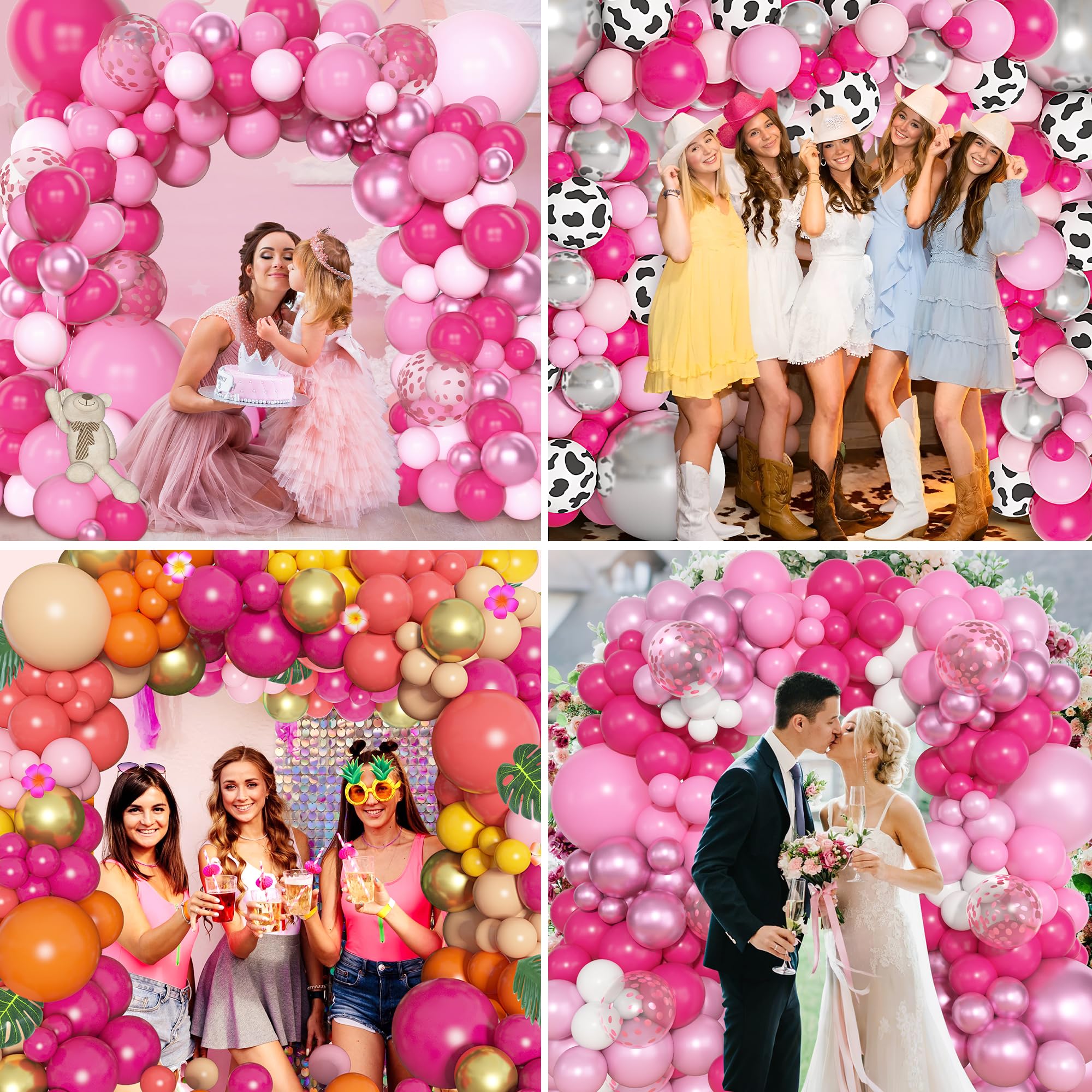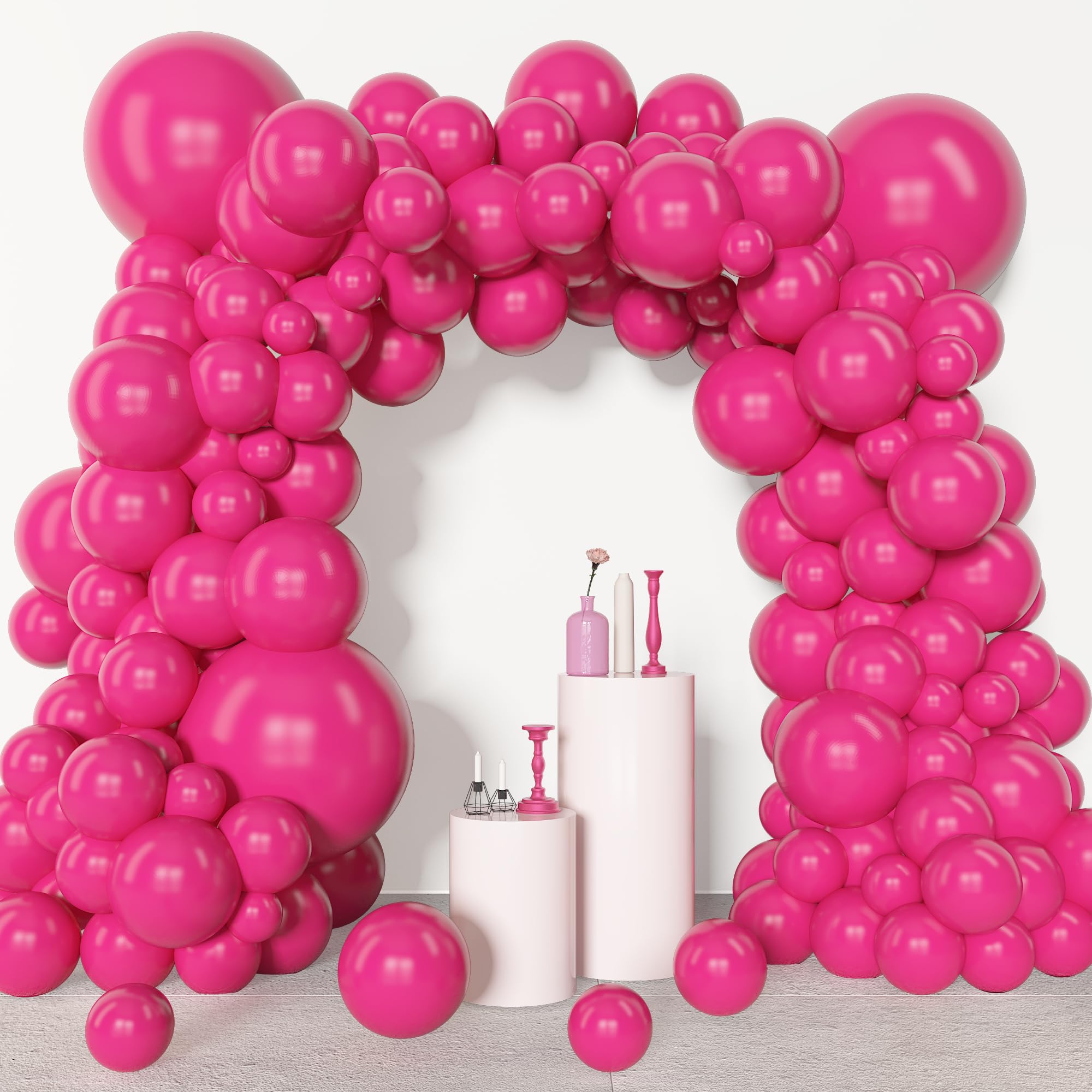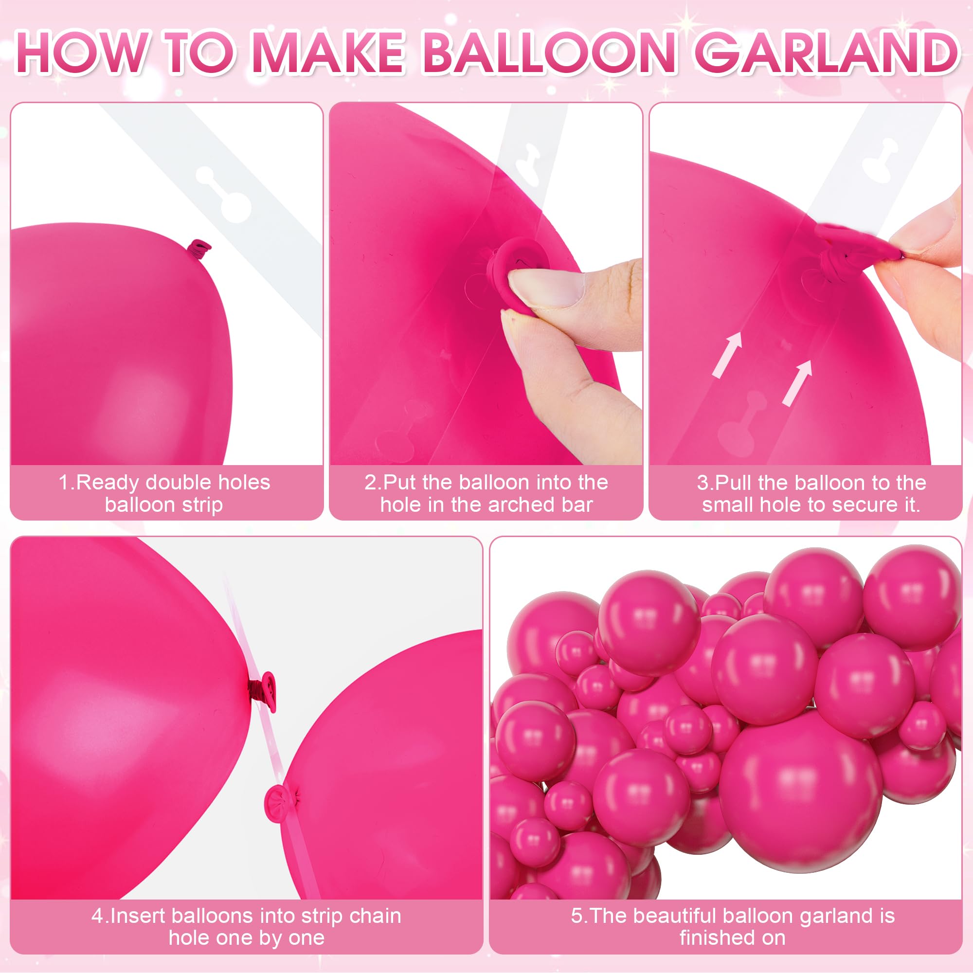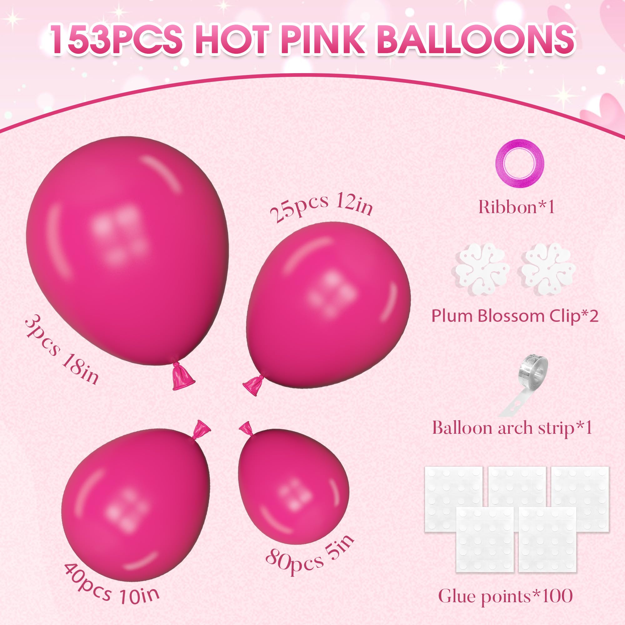 Sufficient Quantity of Hot Pink Balloons: The hot pink balloon arch kit includes 3 pcs 18” hot pink balloons, 25 pcs 12” hot pink balloons, 40 pcs 10”hot pink balloons, 80 pcs 5” hot pink balloons and 5 pcs balloon tools(balloon arch strip, 100 glue points, ribbon, flower balloon clips)