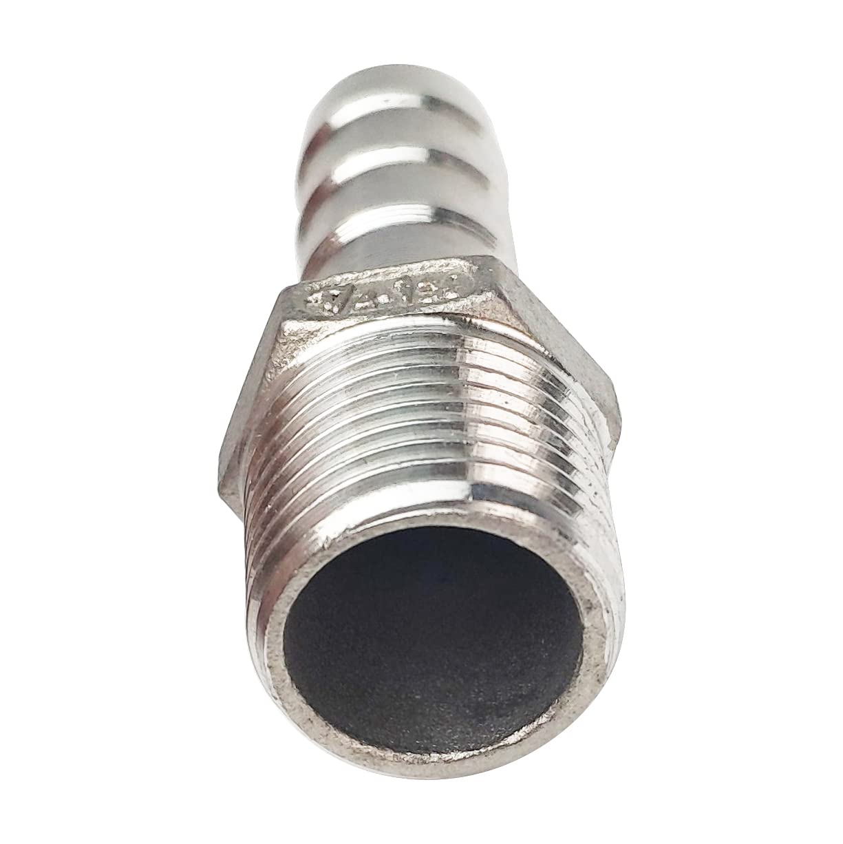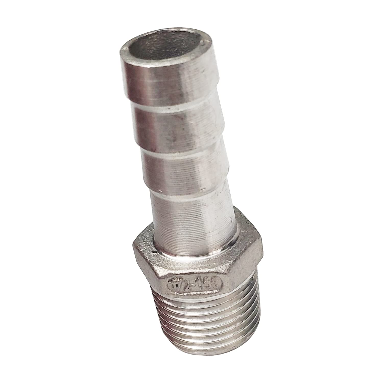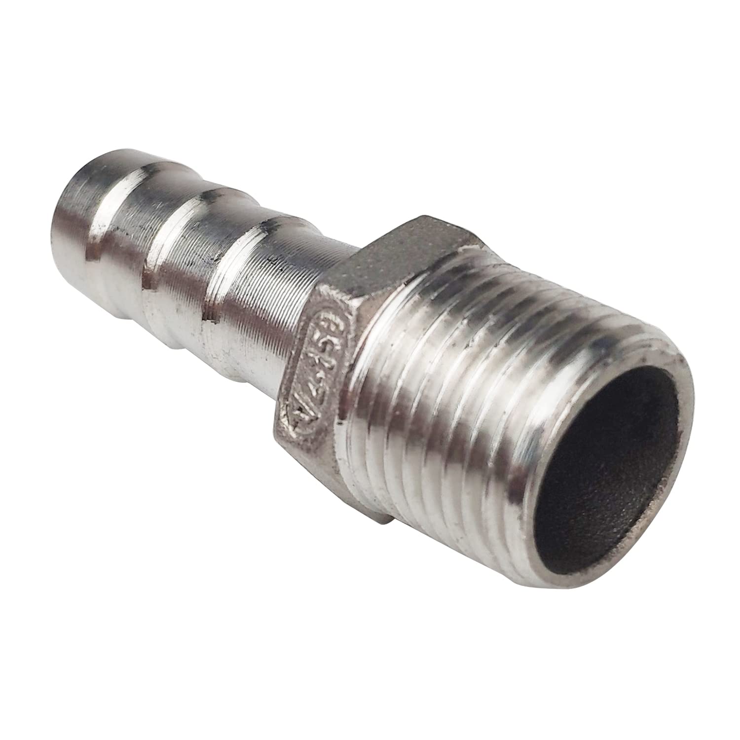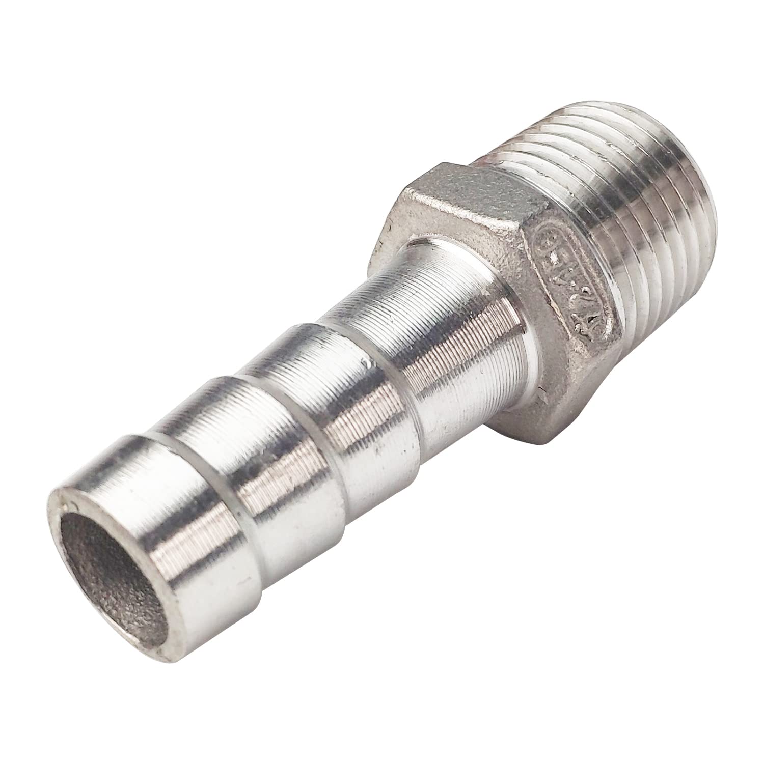 This hose fitting connector has a male end for connecting to threaded pipe conforming to National Pipe Thread (NPT) standards and a barbed fitting for connecting to a hose. The barbed fitting on one end creates a tight seal on flexible or semi-rigid hose when used with a hose clamp or crimp sleeve or ferrule (sold separately), and a male NPT connector on the other end connects to threaded pipe to form a tight, fixed connection Hose fittings are used in systems such as air compressors, automatic manufacturing operations, aircraft controls, and tire installation in industries including agriculture, mining, road construction, firefighting, and aviation Package: 1Pc Hose Tail Pipe Fitting