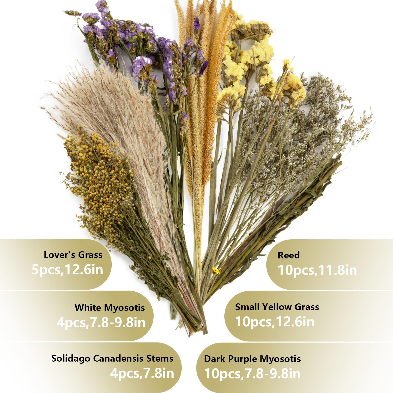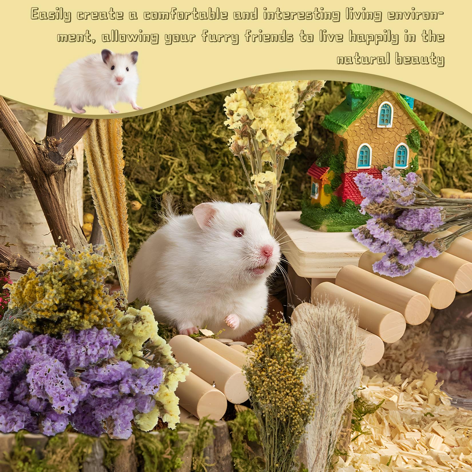 Natural Dried Flower and Grass Mix: Includes dark purple and white forget-me-nots, yellow warbler flowers, whisks, love grass, and small yellow grass; Naturally air-dried with no additives; Gentle enough for small pets like hamsters or guinea pigs to explore or nibble on in small quantities; Great for cage bedding accents or occasional forage material Create a Nature-Inspired Habitat: Designed to mimic wild meadows and bushy landscapes with a blend of rich, natural colors; Encourages digging, burrowing, and exploring behaviors; Brings a refreshing natural touch to enclosed pet spaces Stimulating and Engaging Add-On: Features branch-like elements to promote chewing, climbing, and solo play; Keeps pets entertained while supporting active movement and daily enrichment; A fun way to encourage natural behaviors and prevent boredom Comfortable and Private Rest Zone: Can be placed around nests or feeding areas to create a semi-enclosed layout; Helps reduce external distractions for shy or introverted pets; Provides a cozy, layered habitat for relaxing, hiding, or peaceful meals