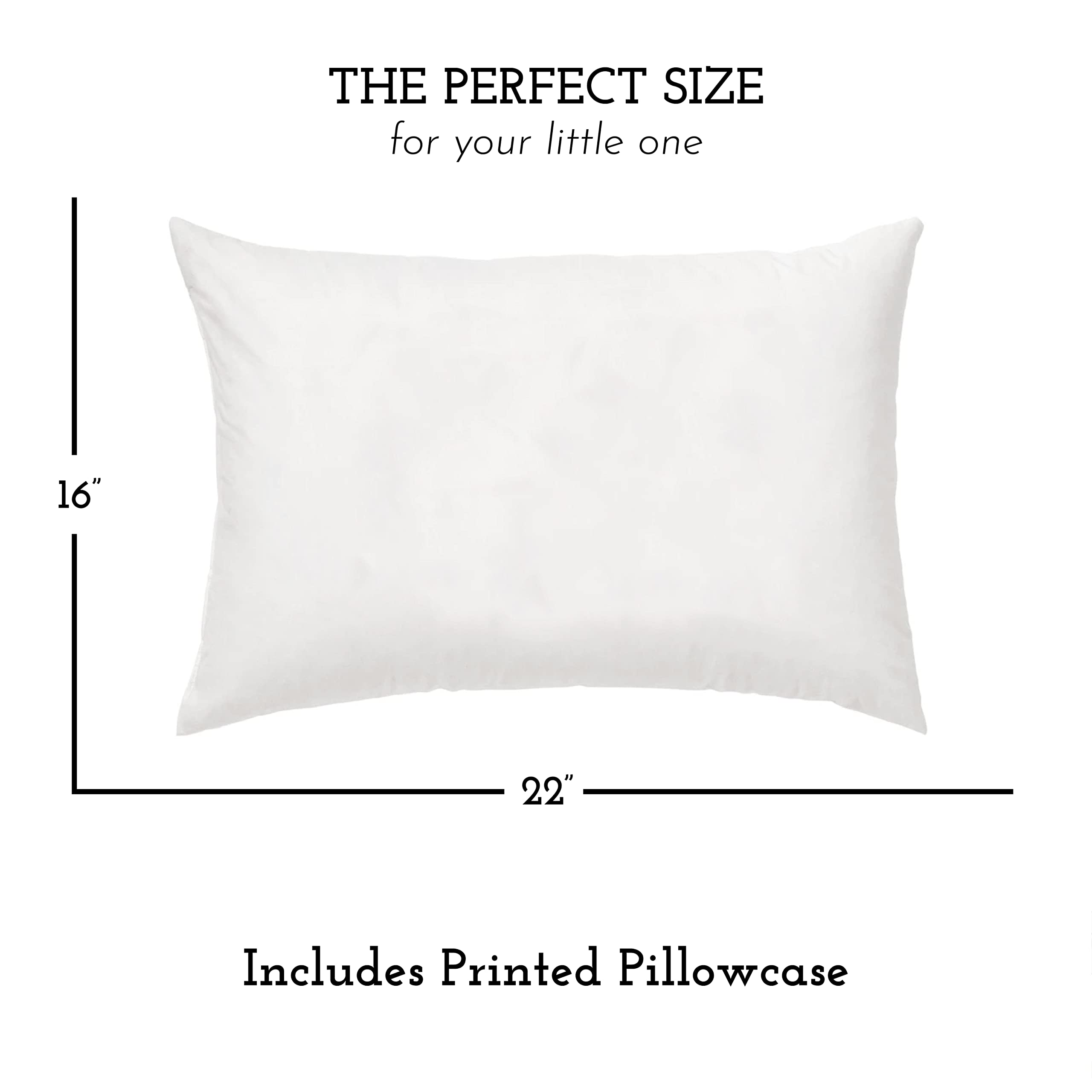 Youth Pillow with Pillowcase 16x22: This is the perfect pillow for your not-so-little kid! In between our toddler pillow and a standard pillow, our 16" X 22" youth pillow is the best pillow for children 4+, or toddlers that need something a bit larger! Comes in colorful designs that appeal to kids.