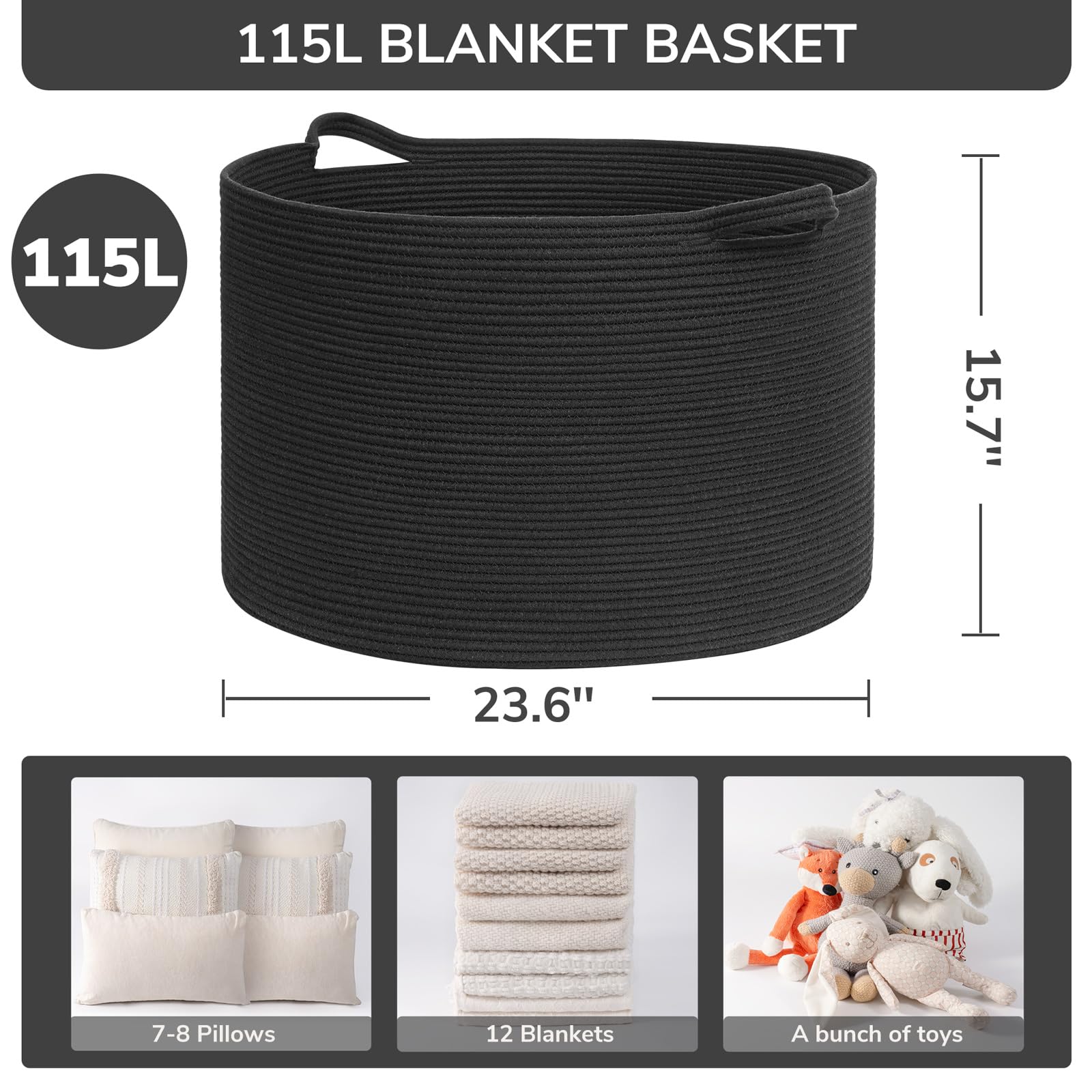 Spacious Jumbo Design. This 115L black and white decor(23.6"D x 15.7"H) provides 30% more space than our 90L model, perfect for larger families or more extensive organizing needs. It easily holds extra blankets, clothes, and toys, keeping your home tidy and stylish.