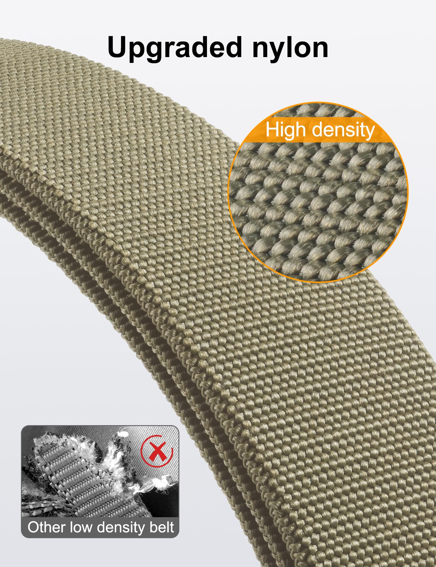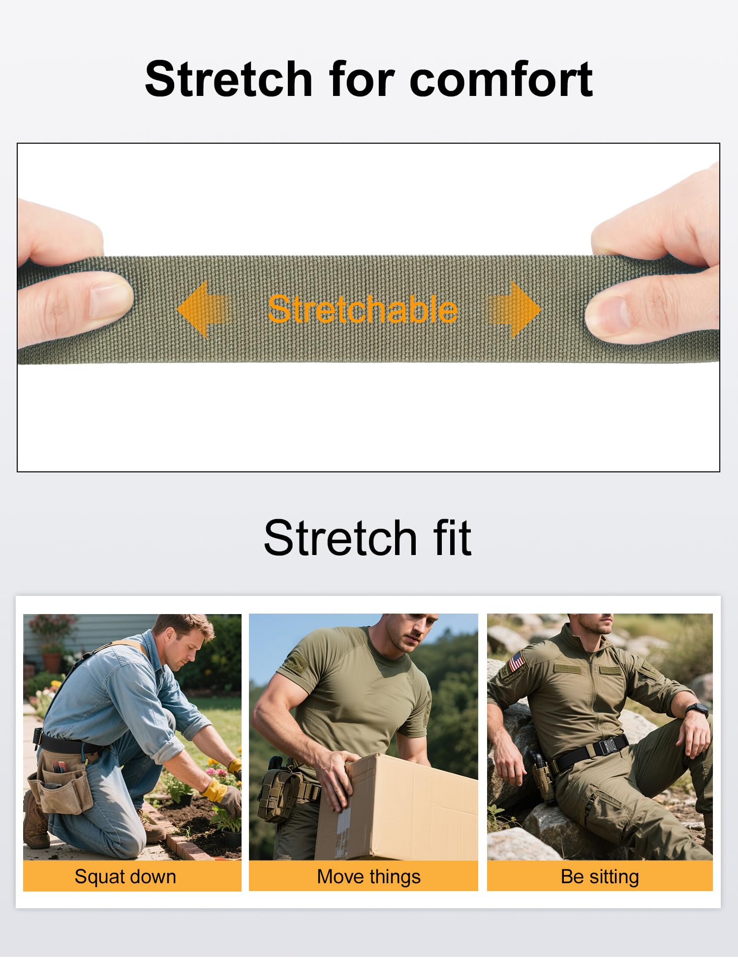 HIGH QULITY STRETCH NYLON:We intent to make the strap be stretch. The strap is made by special stretch material which is more solid than regular belt. More than that, it is very sturdy as well as stretch, which make your waist be more comfortable as well as stay tight, when you take large range of activities. Anyone who do physical activities for a long period of hours will get a great use out of the tactical belt