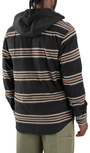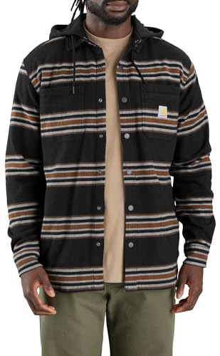 Stay warm while you work. This men's Carhartt shirt jac is built for cold weather with a soft fleece lining and an attached hood. Stretch flannel and a relaxed fit allow you to lift boxes and swing a hammer with ease.