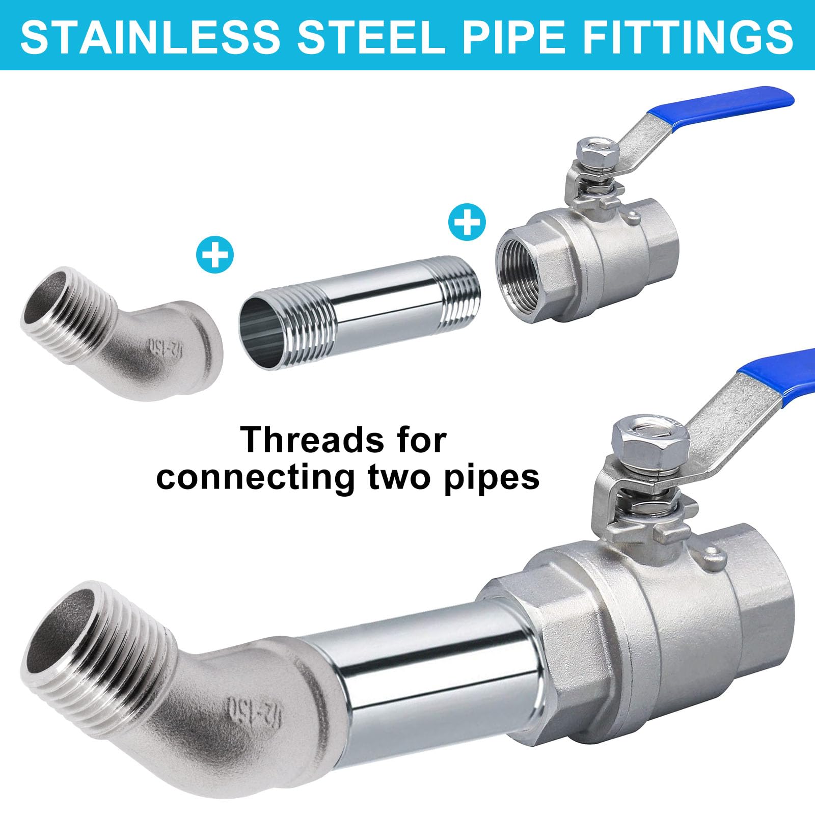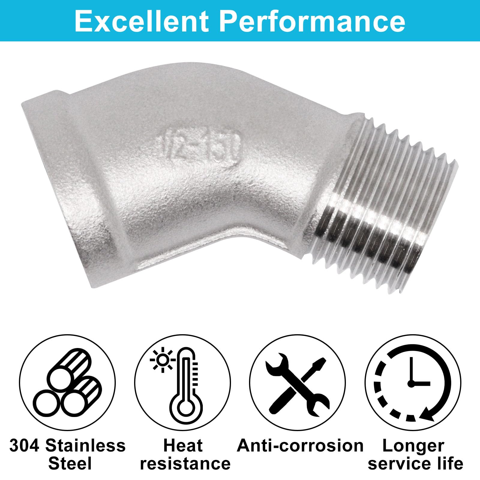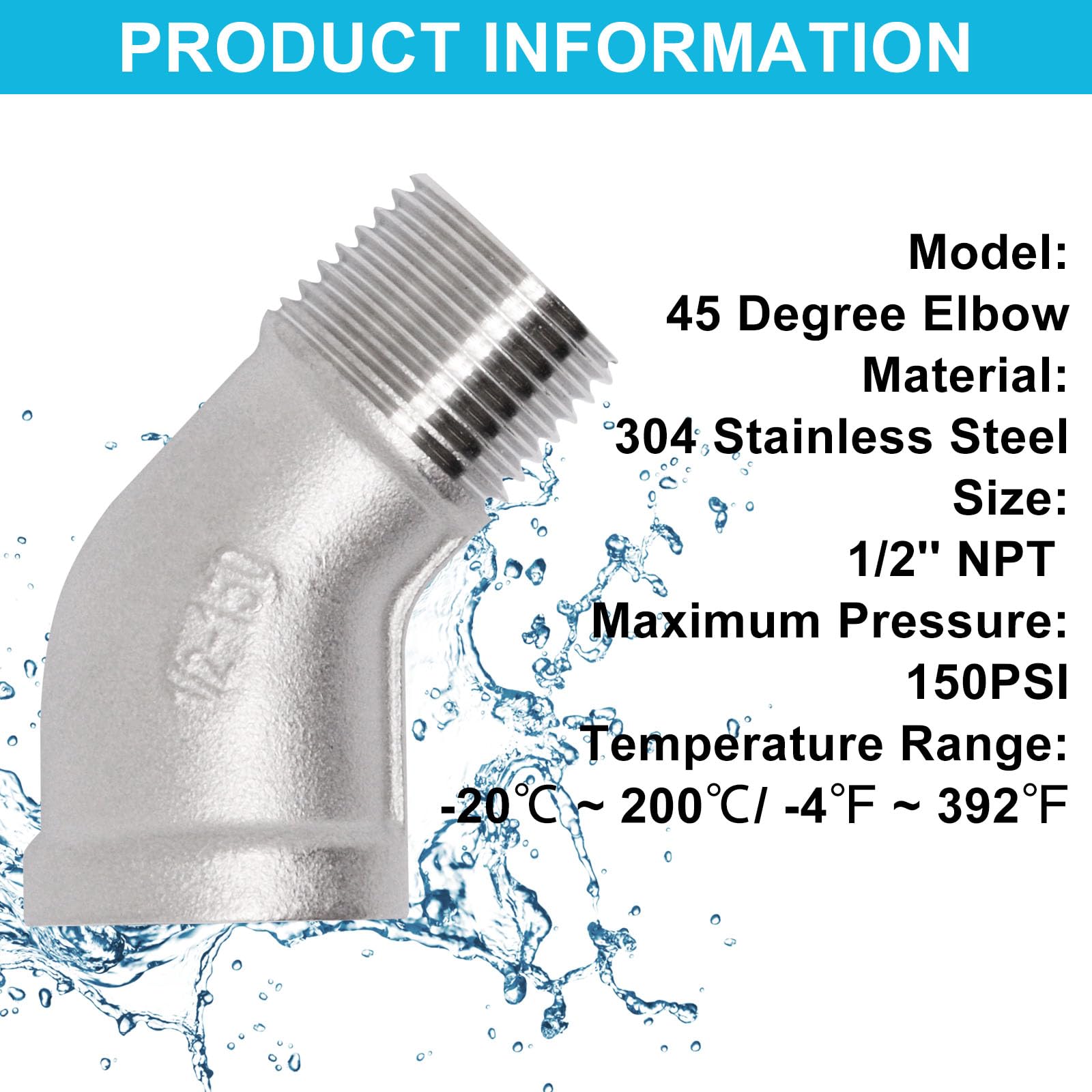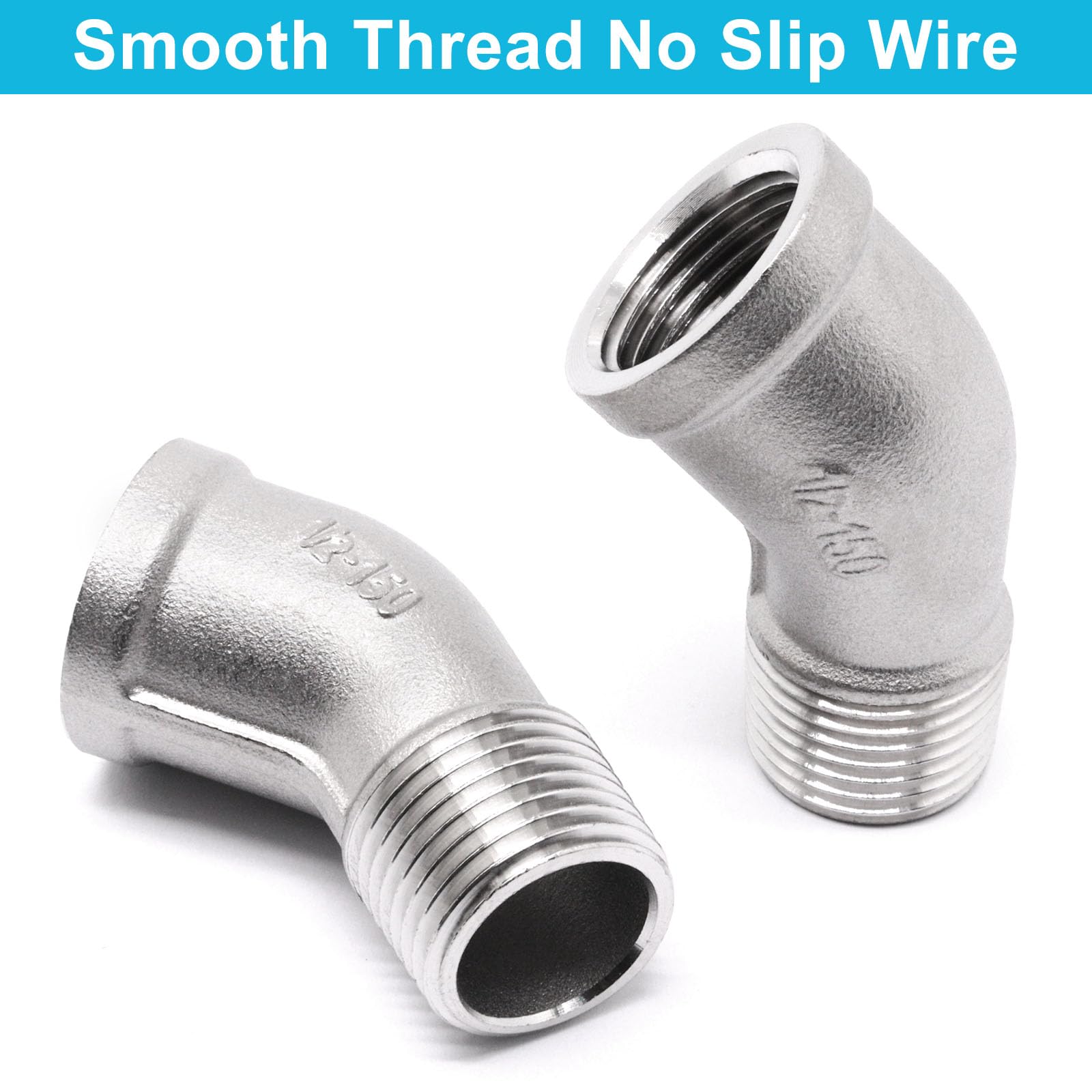 Main Features 1.The elbow is made of high-quality 304 stainless steel,which is strong and resistant to temperature,rust and abrasion. 2.Even in the harsh heavy duty environment with high humidity and high temperature, it is not easy to be damaged. 3.The thickened design of the elbow wall can make its service life longer. 4.It is suitable for electrician,water pipe,automobile,non-motor vehicle and other mechanical maintenance. 5.The elbow pipe fitting has socket openings on both ends and is suitable for connecting two thread pipes at a 45°angle to connect, terminate, control flow and change the direction of piping. Product Specifications Product Name: 45 Degree Elbow Pipe Fitting. Material: 304 Stainless Steel. Type: 1/2" NPT Threaded. Shape: Elbow (Male x female). Connection: NPT-NPT. Color: Silver. Operating Temperature Range: -20℃ ~ 200℃/ -4℉ ~ 392℉. Package Content: 2Pcs 45 Degree Elbow Pipe Fittings. Please check the size of your pipes or pipe fittings before placing an order.