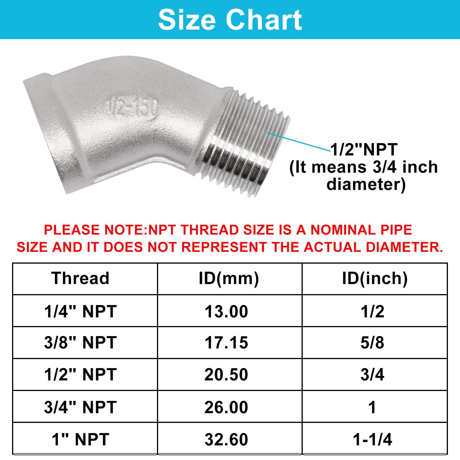 Package Content: 2 Pcs 1/2" NPT male to 1/2" NPT female thread 45 degree elbow. This elbow fitting for connecting pipes or fittings with different end types. (NOTE: NPT thread size does not actual diameter, it is only nominal pipe size)