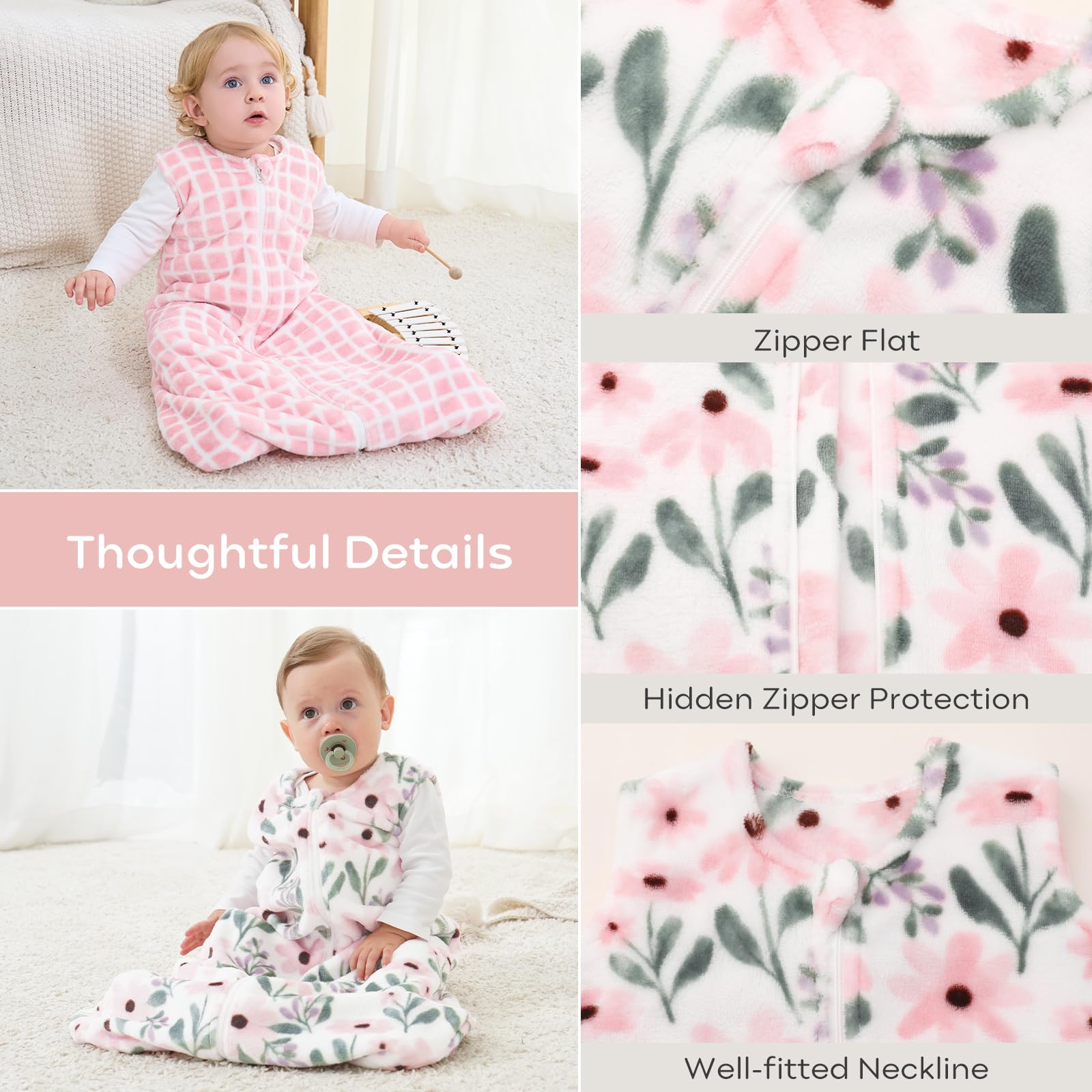 Warm Tips - Fleece baby Wearable Blanket come with 2 pack and machine washable. There are 4 sizes available for your choices: S(0-6 Months/10-18lb), M (6-12 Months/16-24lb), L(12-18 Months/22-18lb), XL(18-24 Months/26-34lbs). Please refer to our size chart carefully before you order sleep sack.