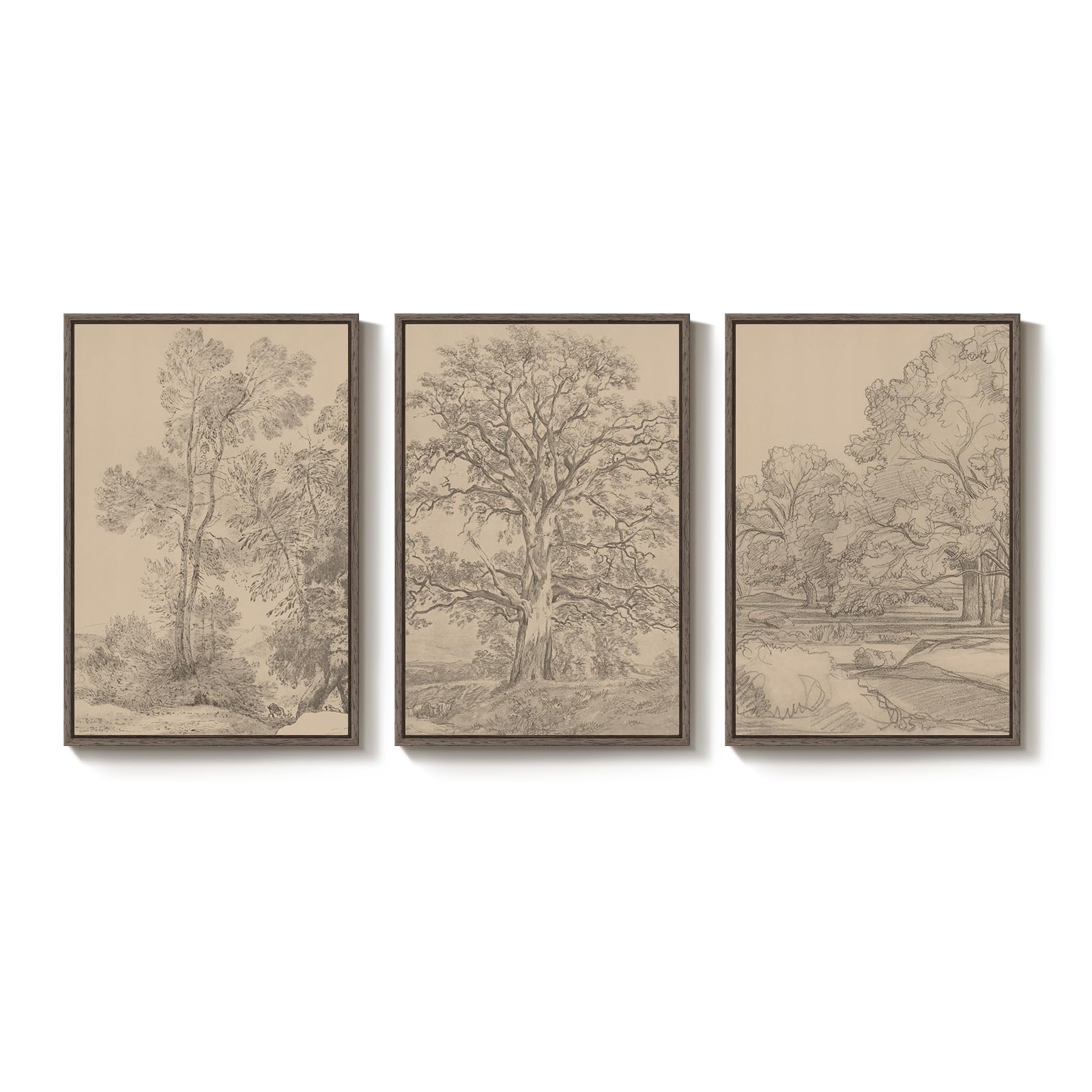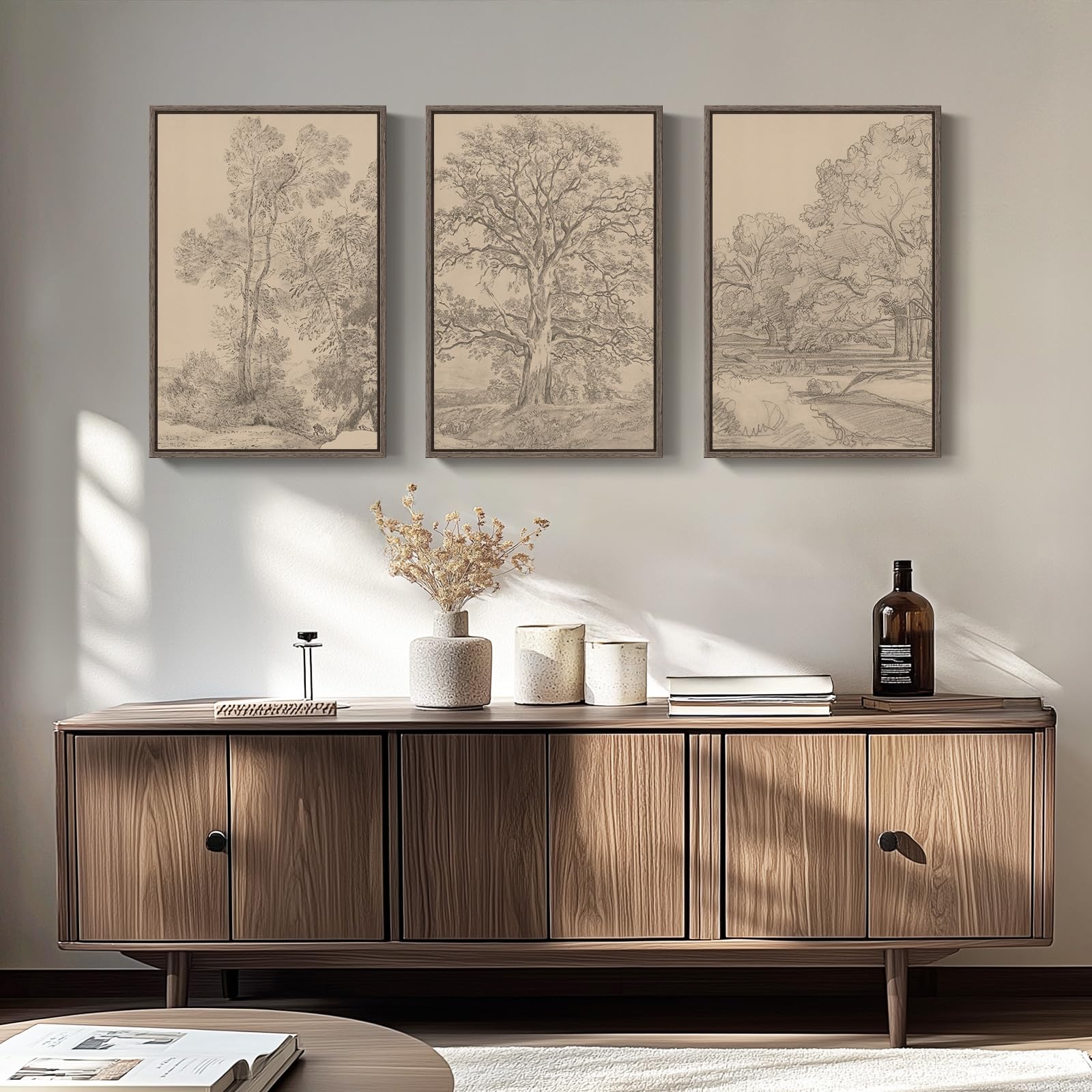 [Large Vintage Neutral Forest Tree Sketch Wall Art]: This set of large vintage tree sketch canvas wall art depicts huge towering old trees,creating a quiet and harmonious rural landscape, which can give people a comfortable and quiet atmosphere, and is especially suitable as an ornament for living room, bedroom, study, hallway, dining, home office.
