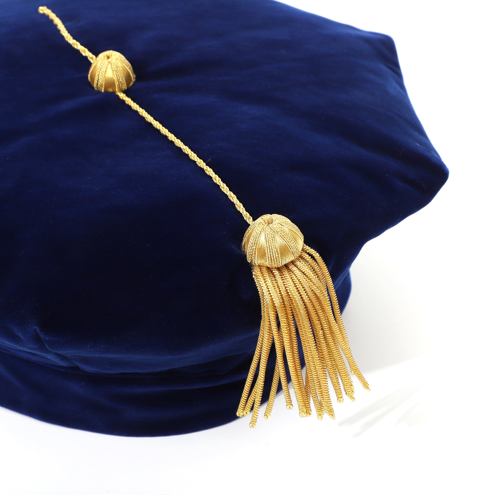 Design: The doctoral graduation tam is made of velvet and adorned with exquisite gold bullion tassel, which is secured to the left. The tam holds its shape very well. The points were pronounced, and the sides not flopped down. Velcro is firmly adhered and not easily detached. This design not only increases the aesthetics of the cap, but also gives it a unique academic significance