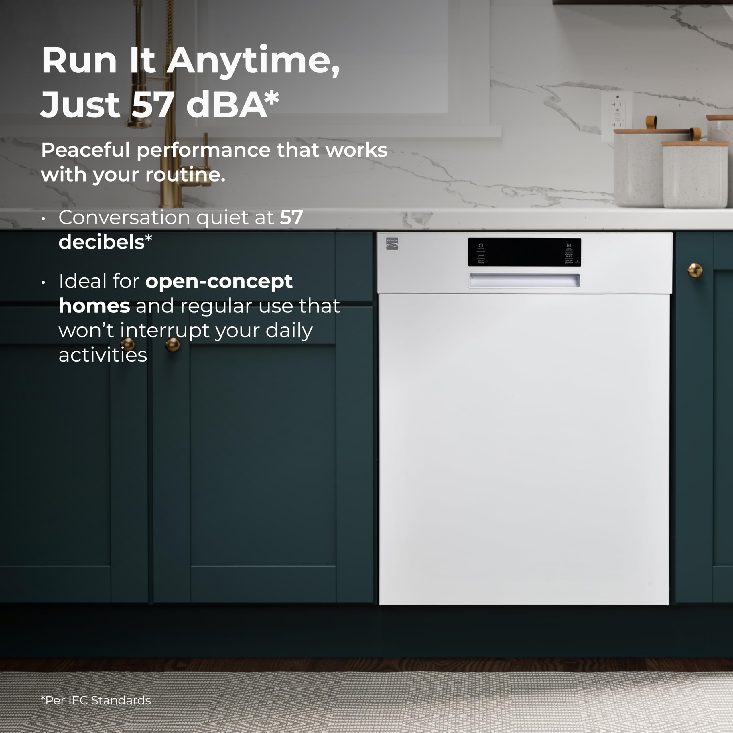 Tackle tough messes with the Kenmore 24" Built-In Dishwasher. The 3-stage UltraWash Filter captures particles as small as fine sand and drains them away so debris doesn’t end up back on your dishes. The SmartWash Cycle takes out the guesswork by detecting soil levels in the water and automatically adjusting water temperature, pressure, and cycle time for the best clean every time. This dishwasher features two spray arms and continuously filters wash water throughout each cycle. Paired with SmartDry technology, it uses hot water to promote condensation and dry dishes quickly, so your plates and plastic containers come out cabinet-ready. Add the Extra Dry option for an added boost on hard-to-dry items. Need clean dishes fast? The Express Cycle handles a full load in just 50 minutes without sacrificing performance. For added flexibility, Delay Start lets you schedule the cycle to begin 1 to 24 hours later—perfect for running loads during off-peak hours or when it’s most convenient for you. With space for up to 14 place settings, a flexible adjustable rack system, and a sleek stainless steel tub that retains heat and resists stains, this dishwasher looks as good as it performs. Built-in leak detection monitors water flow and will automatically drain the tub and alert you if a problem is detected, helping protect your home from water damage before it starts. Energy Star certified to help conserve water and energy, this dishwasher delivers serious cleaning power while helping reduce your utility bills.