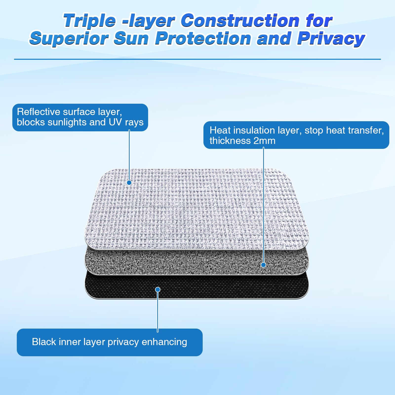 Three Layer Material Structure: the RV blackout window shade comprised of three layer material, the outer reflective silver aluminum foil bubbles layer repels sunlight and UV rays, the middle insulation cotton layer or bubble type material blocks heat, and the inner black or silver layer ensures privacy, ensuring your comfort no matter the season