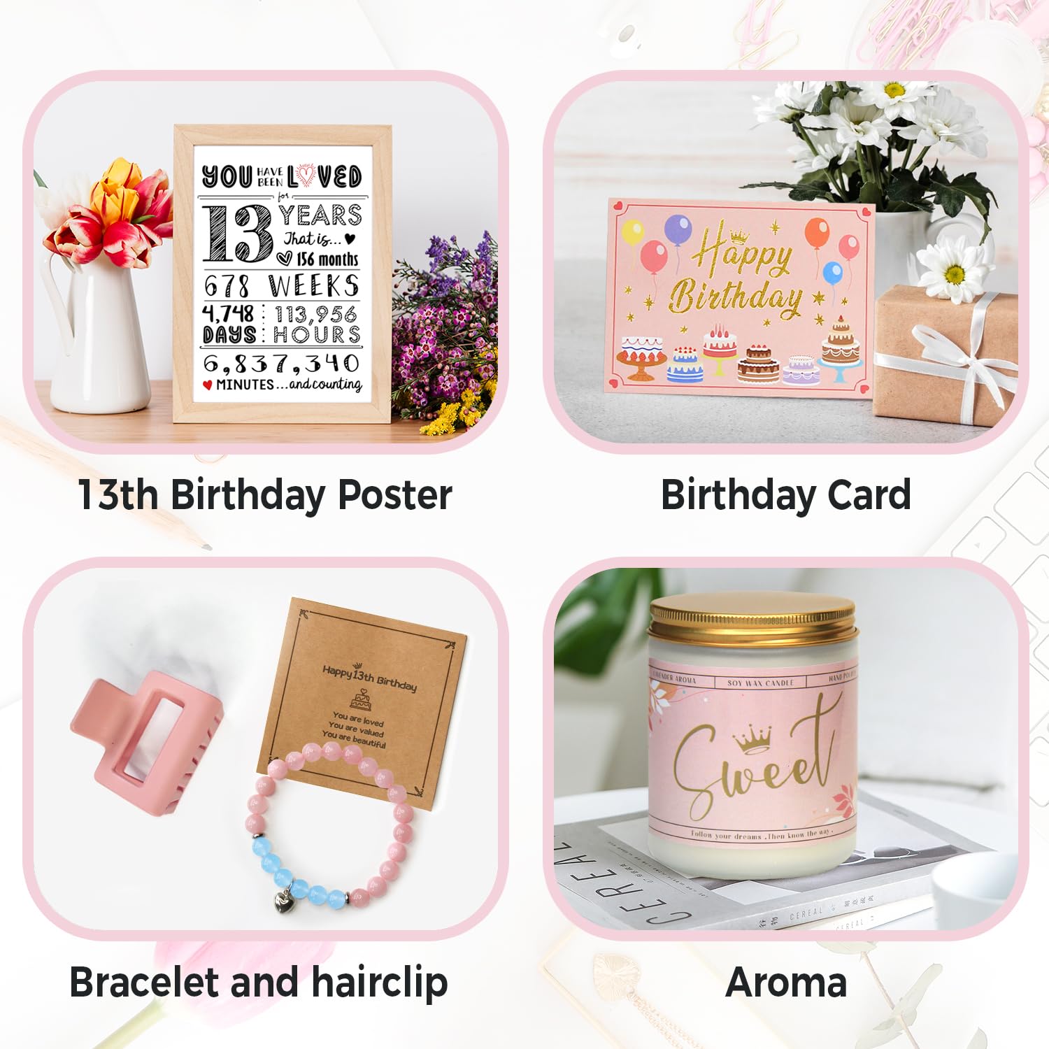 Each of our gifts is carefully selected: with the exclusive words "MAKING THE WORLD A BETTER PLACE SINCE 2012" printed on the makeup bag, reminding her of how great and unique she is. A rose gold folding metal mirror with the words "Celebrating 13th Birthday" printed on it. Candles with the fragrance that girls love, bead bracelets, and more