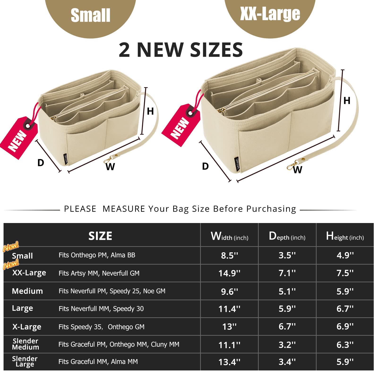7 Sizes, Better Fit: In addition to the standard 5 sizes, we've introduced a smaller purse organizer insert for compact handbags like Onthego PM and Alama BB, as well as an XXL insert for larger totes like Onthego GM, Neverfull GM, and Coach Field Tote 40