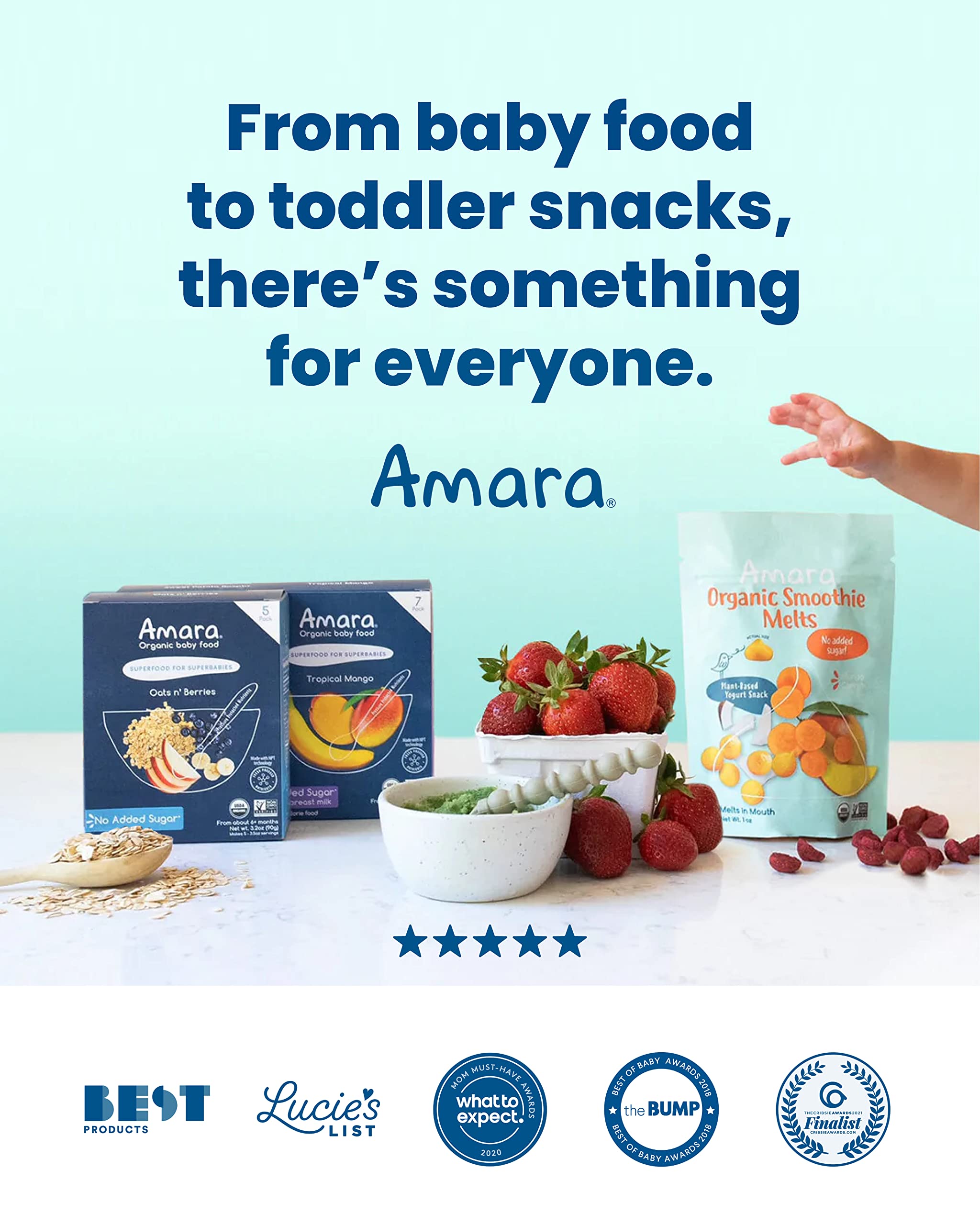 NO ADDED SUGAR: Amara delivers nutritious baby food and snacks that are 100% organic and non-GMO. The first melt-in-mouth snack without any added sugar or fillers, these melts keep little hands busy and tiny tummies full without the sugar crash.