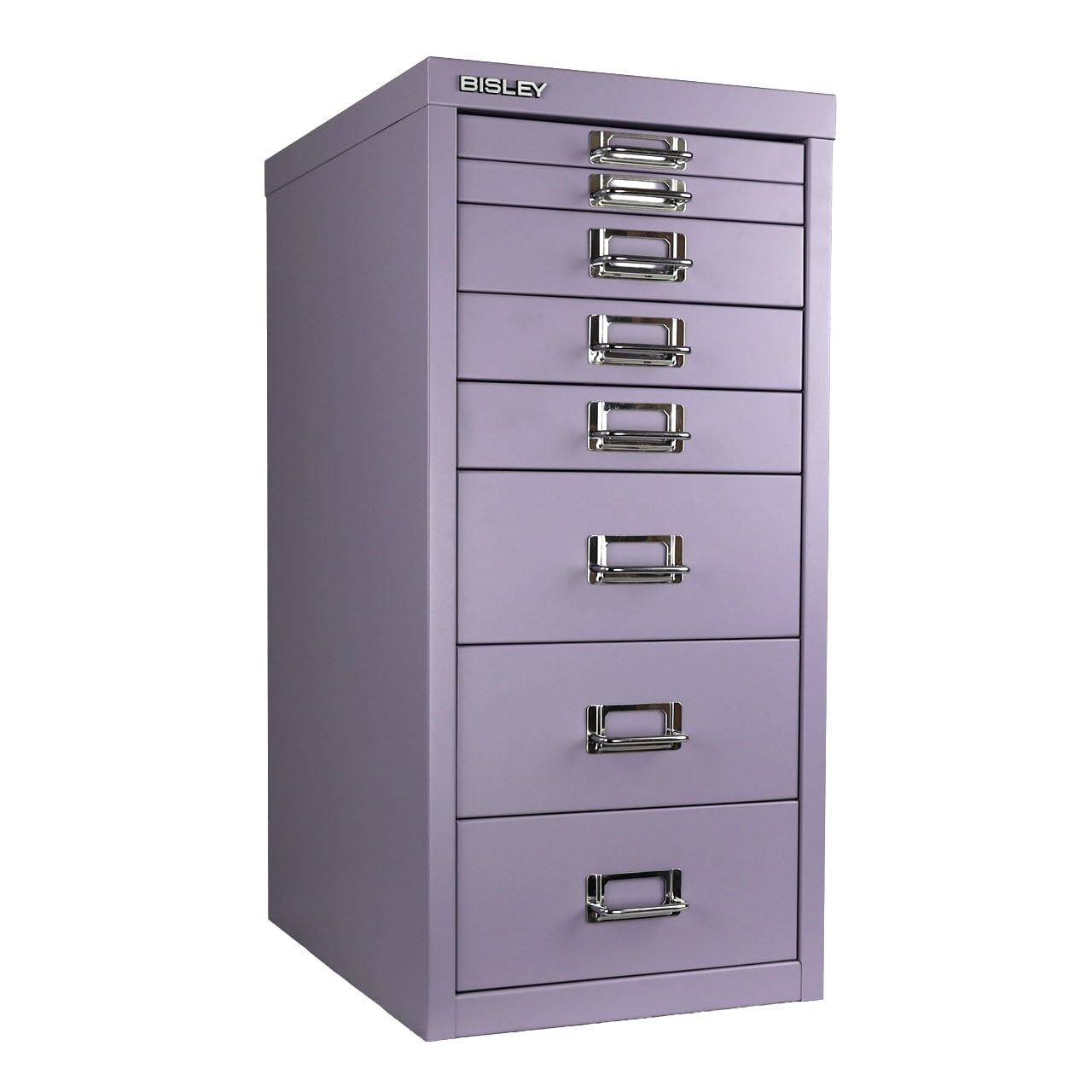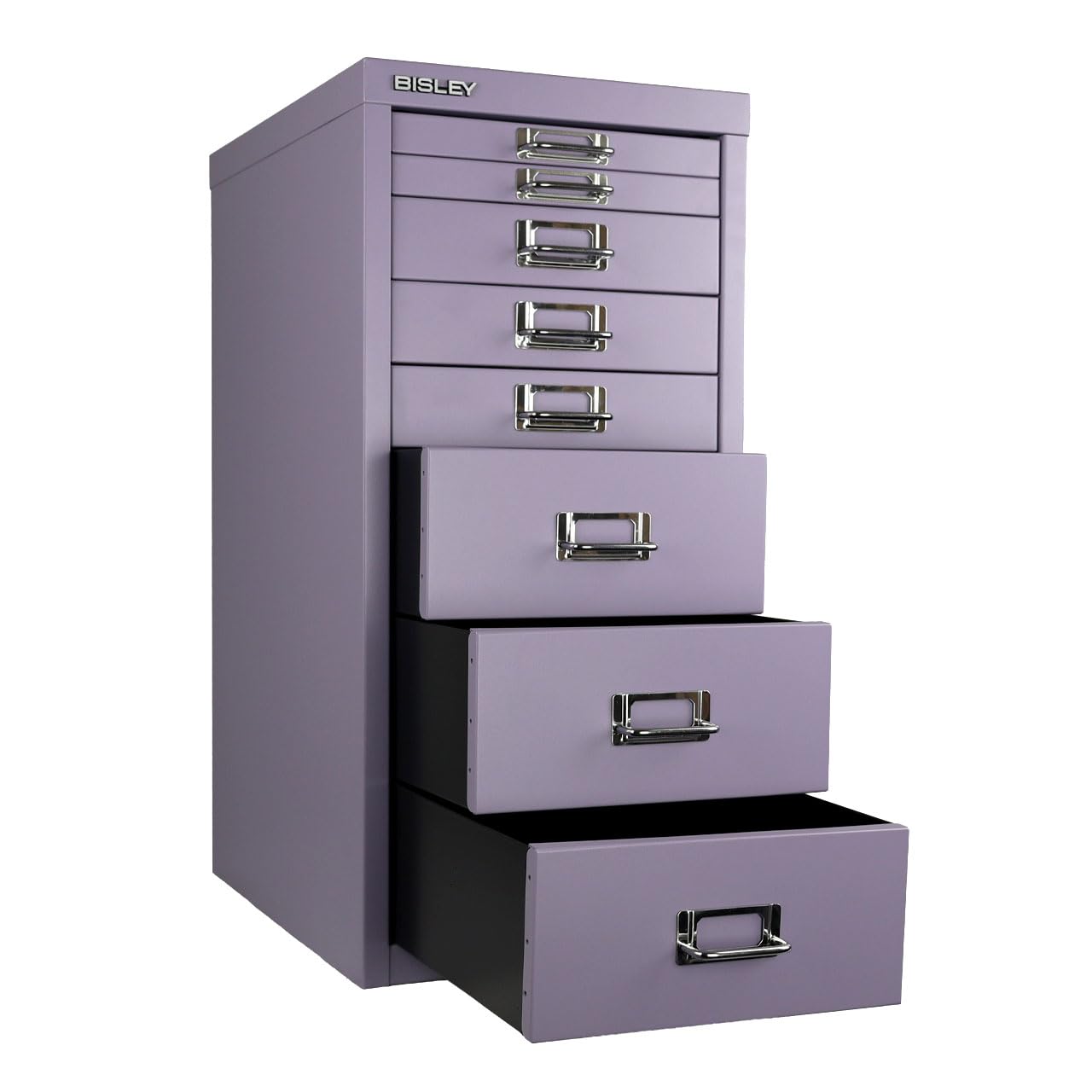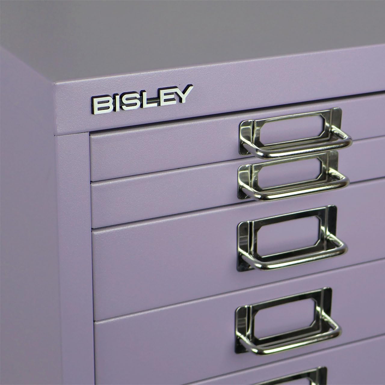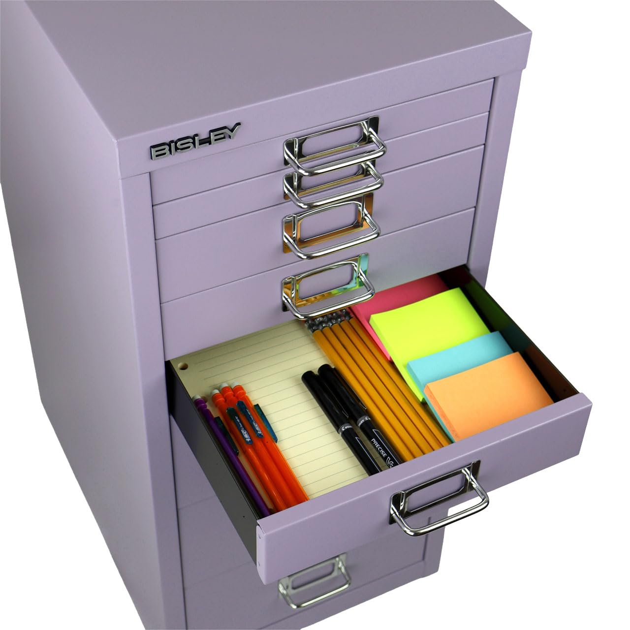 Sleek chrome pull handles with label slots on every drawer and a sheet of customizable labels help you identify drawer contents easily