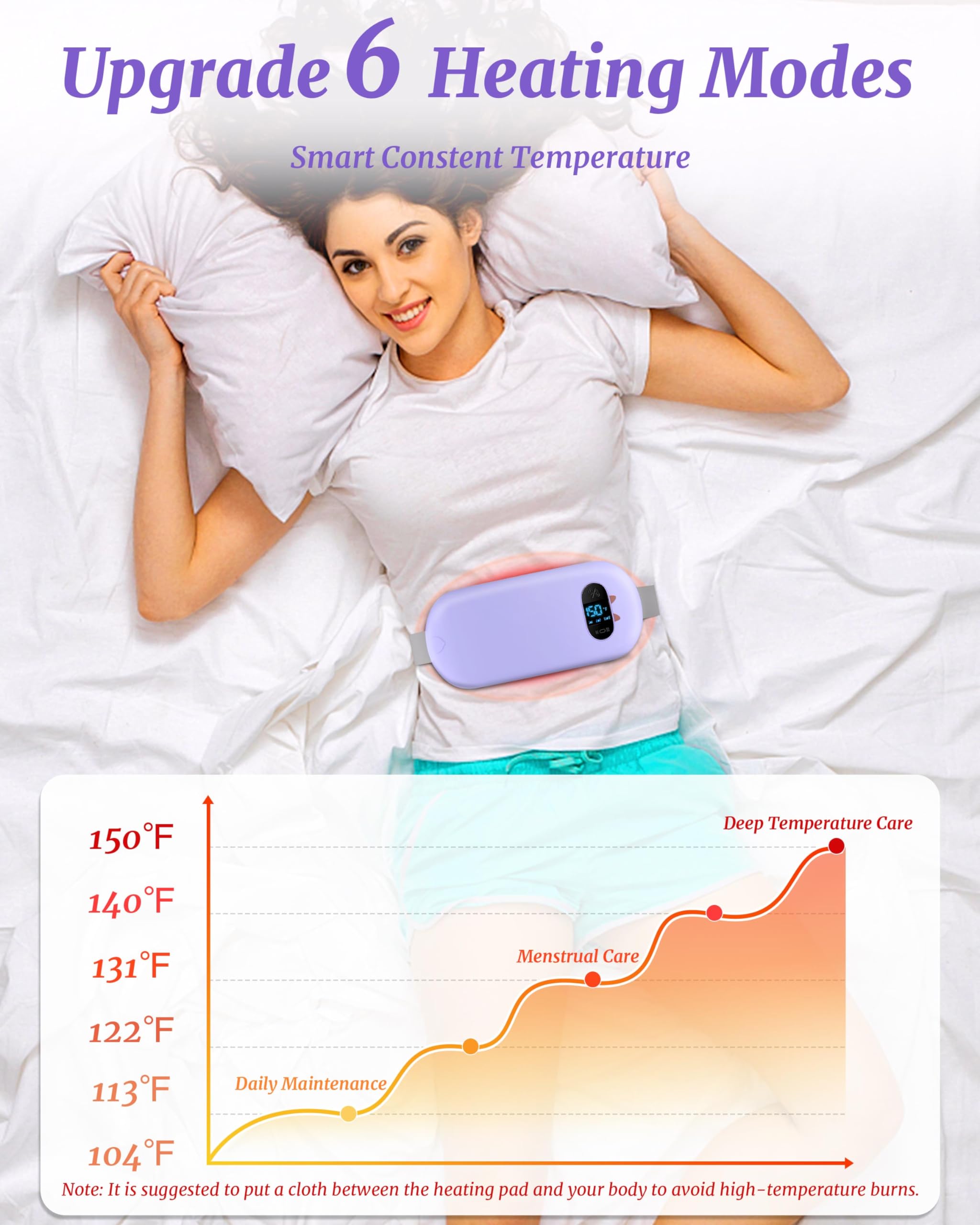 Upgrade 6 Heating & Massage Modes: We upgraded the menstrual relief heating pad to 6 heating modes from 104℉ to 150℉ and 6 massage levels to better meet your different daily needs and preferences. Vibrating modes could work with the heating function simultaneously or work independently as a muscle massager to soothe sores.