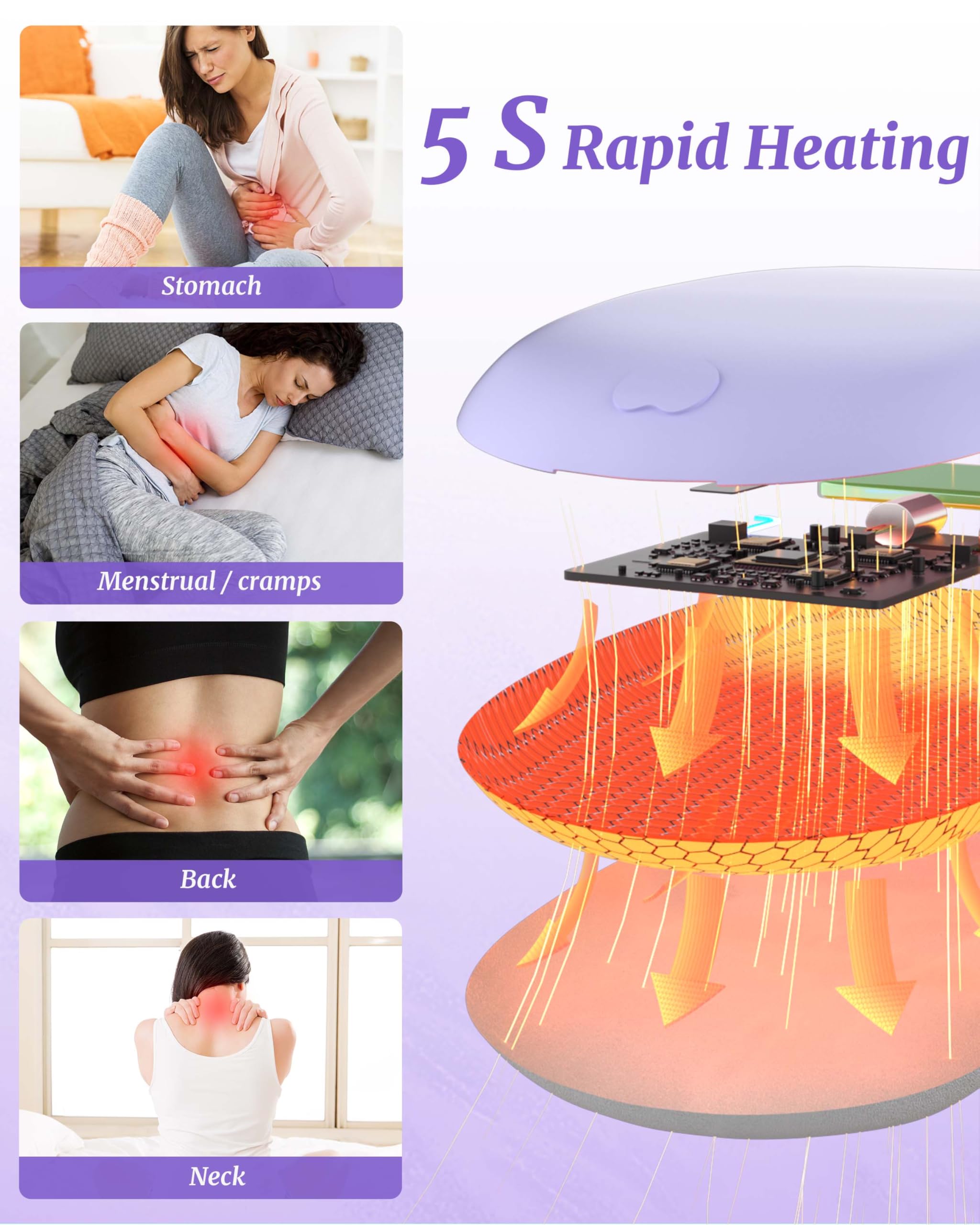 Fast Heating for Pain Relief: Portable heating pad heats up rapidly in 5 seconds with soothing heating therapy that improves blood circulation to relieve menstrual cramps, abdomen chill, back pain, and stomach pain. Soft velvet fabric on the heating side of electric heating pad provides maxim comfort for your period.