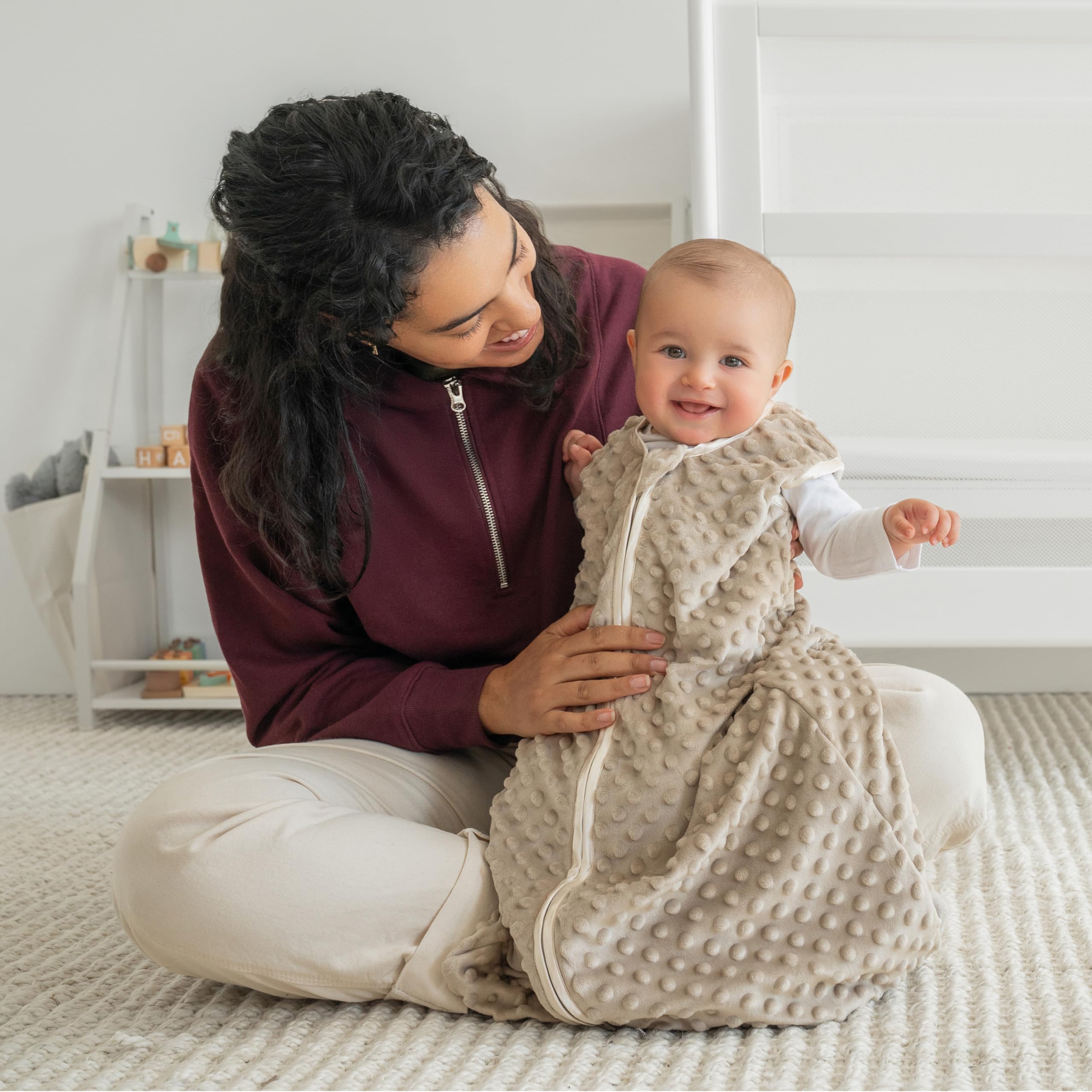 ULTRA SOFT PLUSH FABRIC : Made from premium Plushy Dot Velboa fabric, this cozy baby wearable blanket delivers buttery-soft comfort and warmth. Gentle on delicate skin, it’s ideal for bedtime or naps and perfect for year-round use.