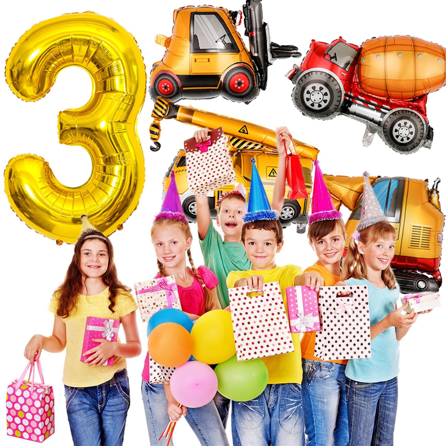 【3rd Construction Party Decorations】Birthday Construction Balloons set include 1pcs 40inch goldballoons numbers 3,1pcs large foil excavator balloon, 1pcs mylar foil crane balloon, 1pc large foil forklift truck balloon,1pc large cementing truck foil balloon, 2pcs round foil happy birthday construction balloons, 1pc ribbon and straw.These construction balloons will make a cool construction themed birthday party for your boy.