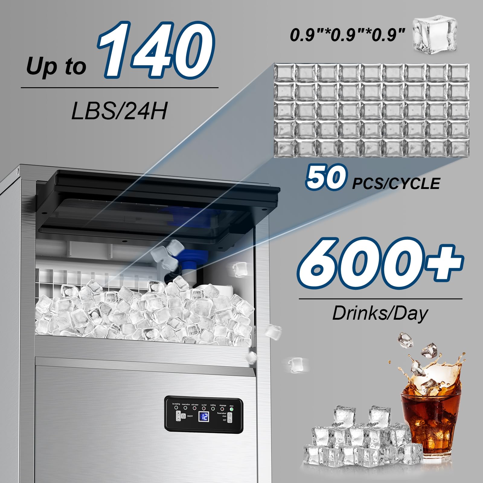 Rapid Ice-Making & Exceptional Output - Our upgraded commercial ice maker is designed for efficiency, producing 50 clear ice cubes in just 6-15 minutes per cycle and up to 140 lbs of ice in 24 hours. Perfect for both home and commercial use, ensuring a continuous ice supply.