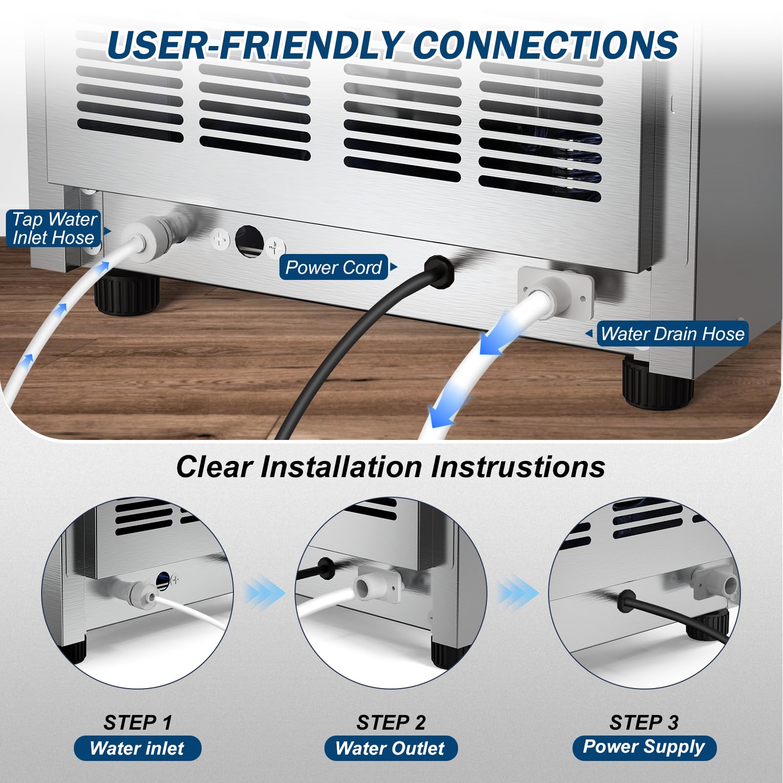 Easy Connection & Setup - Includes a complete set of accessories: water inlet hose, drain hose, quick connector, premium water filter, and ice shovel. Simply connect the hoses, and the machine will automatically fill and drain water, starting the ice-making cycle seamlessly.
