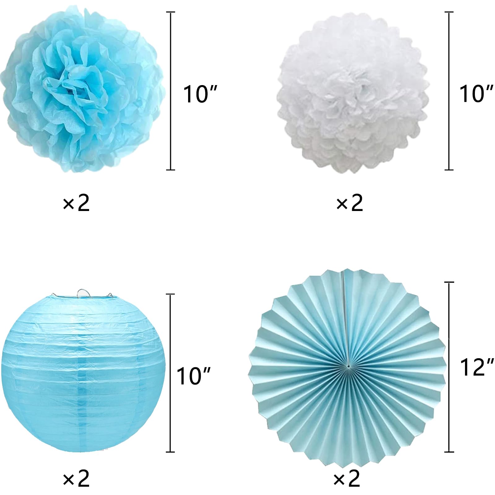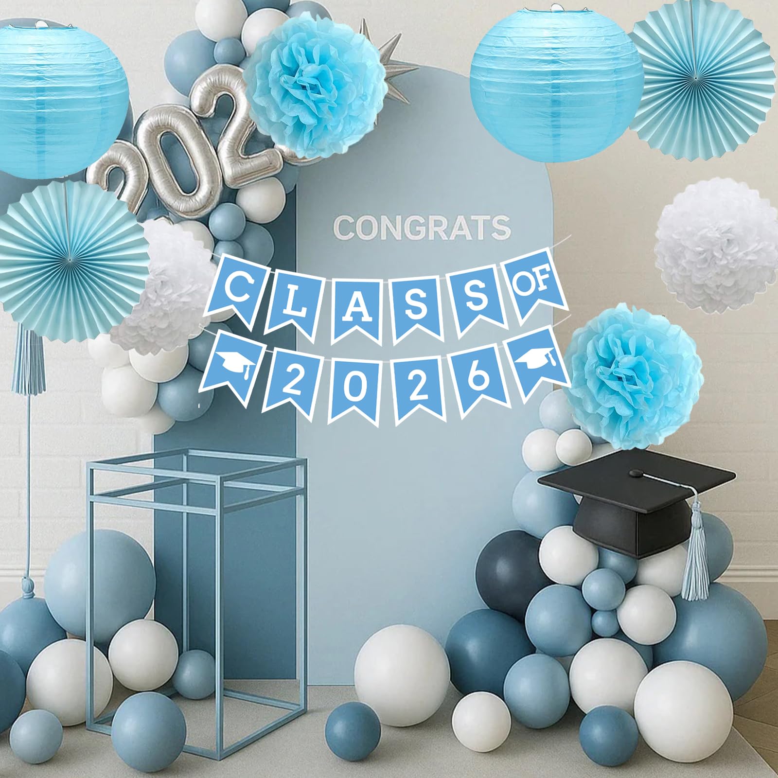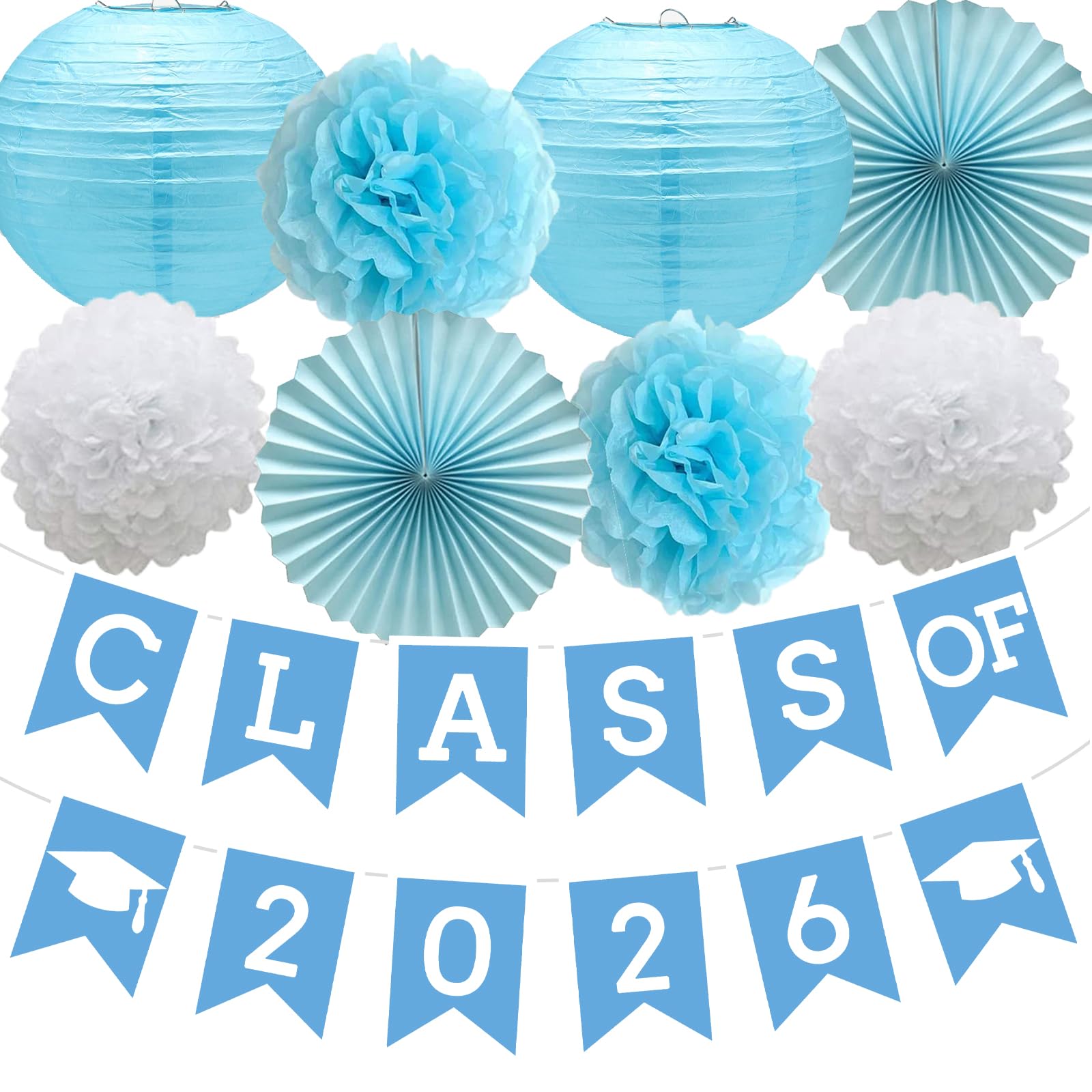 Quantity: 1 light blue class of 2026 banner with 2 white grad caps, 2 light blue pom poms flowers, 2 white pom poms flowers, 2 light blue paper lanterns, 2 light blue paper fan flowers