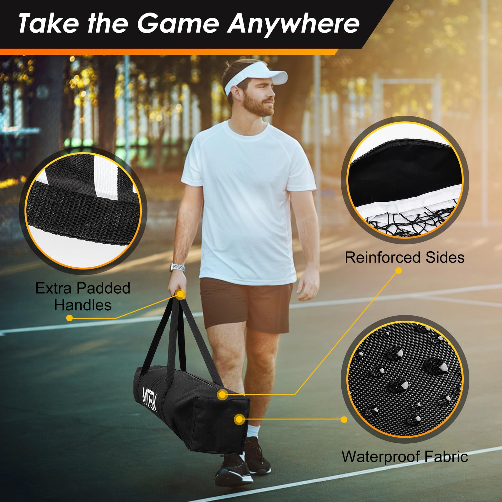 Portable carry bag: Our pickleball net for driveway come with a sturdy zippered oxford fabric carrying bag for easy transportation and storage. All net accessories fit neatly inside, making it ideal for on-the-go use