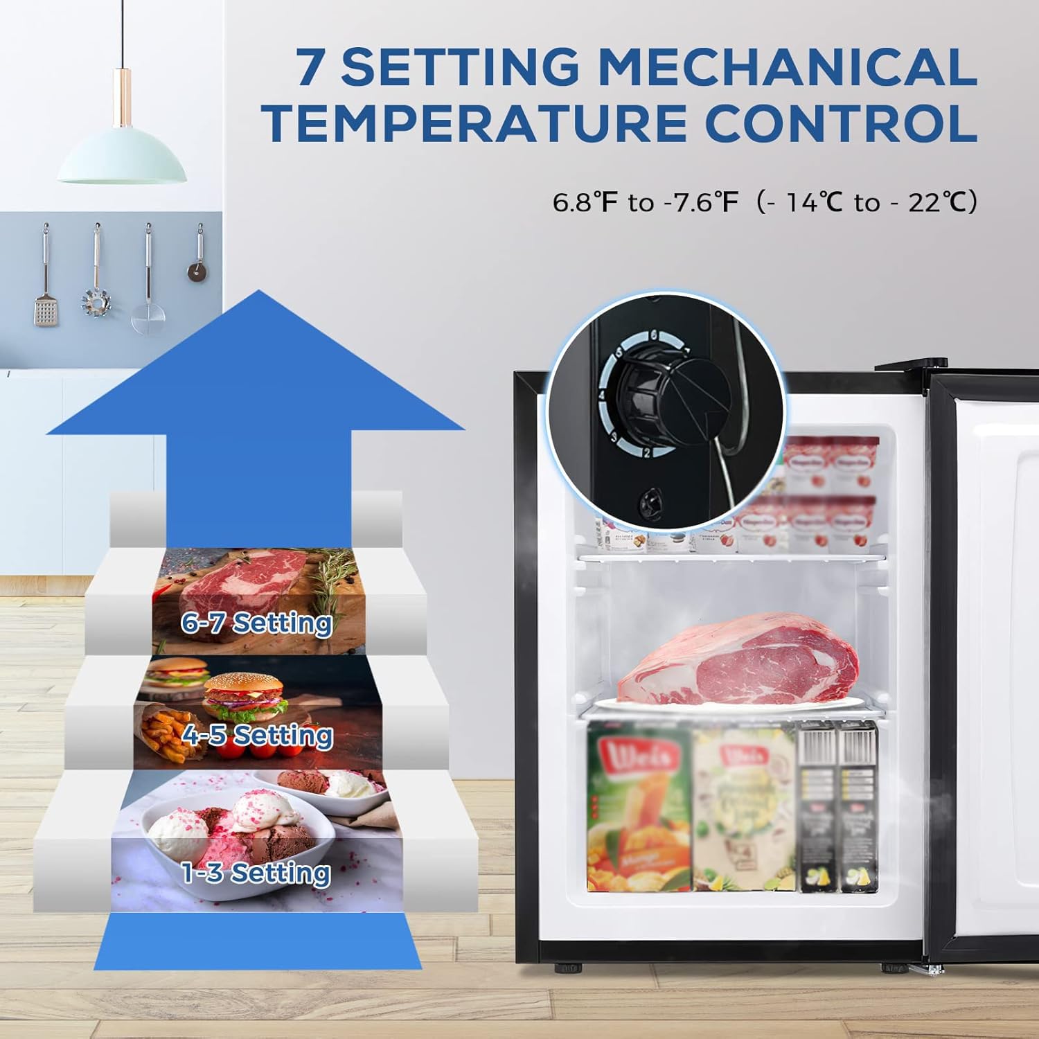 7-Speed Thermostat Design:Built-in temperature control knob, you can easily adjust the desired temperature level. "1" means the hottest, "7" means the coldest, the temperature adjustment range is -7.6℉ to 6.8℉.One-piece design, upgraded sealing strip as well as thermal insulation, which can effectively reduce the generation of frost and easy to clean - Knob on the back of the freezer
