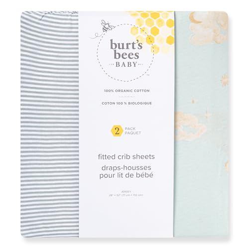 Embrace the comfort of the Burt's Bees Baby Fitted Crib Sheet, a nursery and baby registry gift essential. Crafted with care from 100% organic GOTS-certified* cotton, this sheet is a sanctuary of comfort for your baby's delicate skin. Combed and ring-sun, these sheets are super soft, durable, and breathable, promoting restful sleep for your baby. Our BeeSnug 360 design ensures a snug fit for standard cribs and toddler mattresses, making it a versatile choice for any nursery. These easy-care, machine-washable sheets get softer with every wash while the patterns remain vibrant. Available in a variety of adorable hand painted watercolor prints suitable for baby boys and baby girls, our sheets not only complement your nursery dΓ©cor but also serve as a cherished essential for any parent. From floral patterns to animal and geometric patterns, you can mix and match to find the perfect crib sheet to match your nursery theme. Our classic jersey knit fabric gives your little bee the same feeling you get when you slip into your favorite t-shirt. It is warmer to the touch than woven sheets, providing a smoother transition from snuggling in your arms to safely sleeping in their crib. *GOTS Certified by CU 831717
