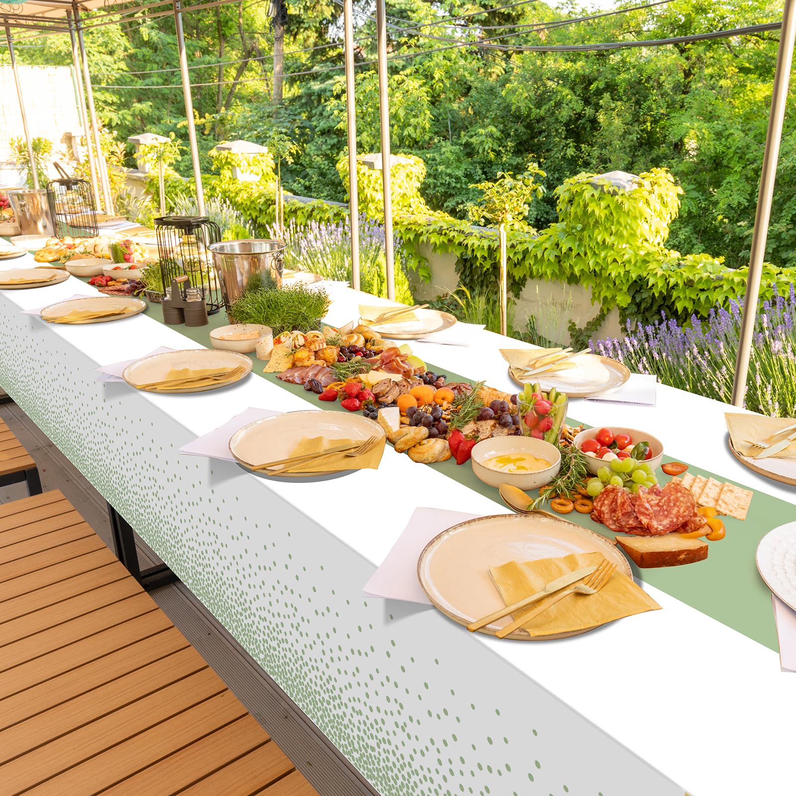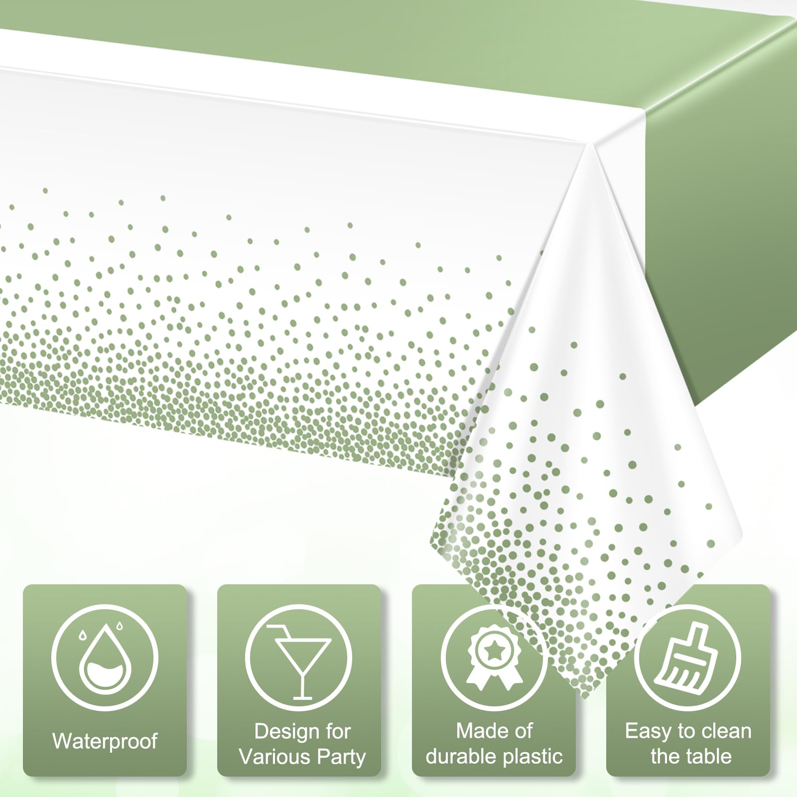 What will you receive: 12 pieces plastic white and sage green party tablecloth,all over printed with sage green dot on white background,the gold table runner in the middle is printed pattern,ideal for decorating your graduation birthday party supplies and decorations