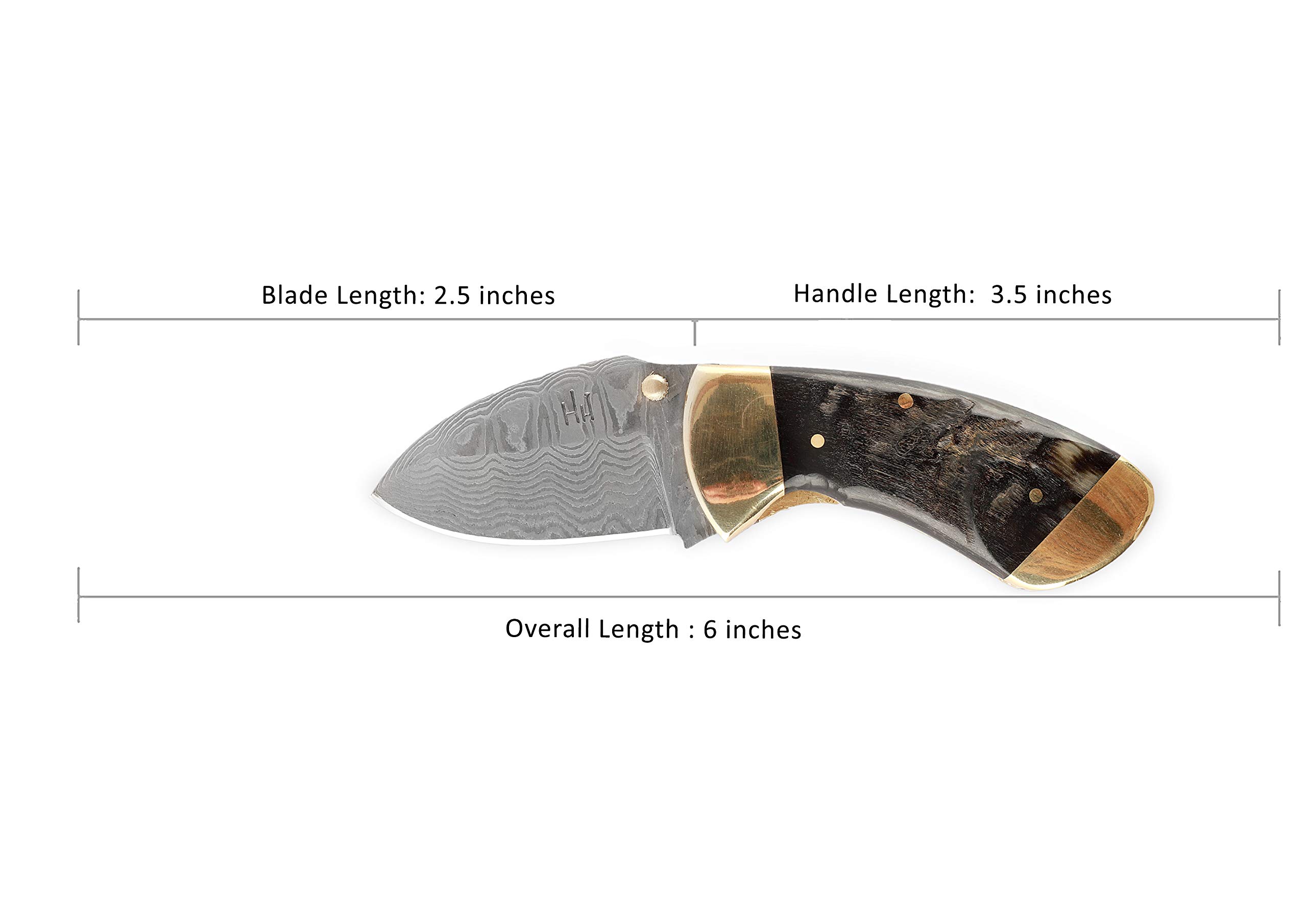 This exquisite Damascus steel pocket knife combines traditional craftsmanship with functional design, making it an essential tool for outdoor enthusiasts and collectors alike. Featuring a stunning 2.5-inch Damascus steel blade with distinctive wave patterns, this folding knife showcases the artistry of handmade blade forging. The blade's unique layered construction not only creates a visually striking appearance but also delivers exceptional strength and edge retention for all your cutting needs. The knife's rams horn handle, measuring 3.5 inches, is beautifully complemented by brass bolsters and decorative pins, creating a comfortable and secure grip. The natural variations in the horn material ensure that each knife is truly one-of-a-kind. With an overall length of 6 inches when open, this compact folding knife is perfectly sized for camping, hunting, and everyday carry. The included leather sheath provides safe storage and convenient portability. This handmade folding hunting knife represents a perfect blend of form and function, making it an ideal choice for those who appreciate quality craftsmanship and reliable performance in the field.