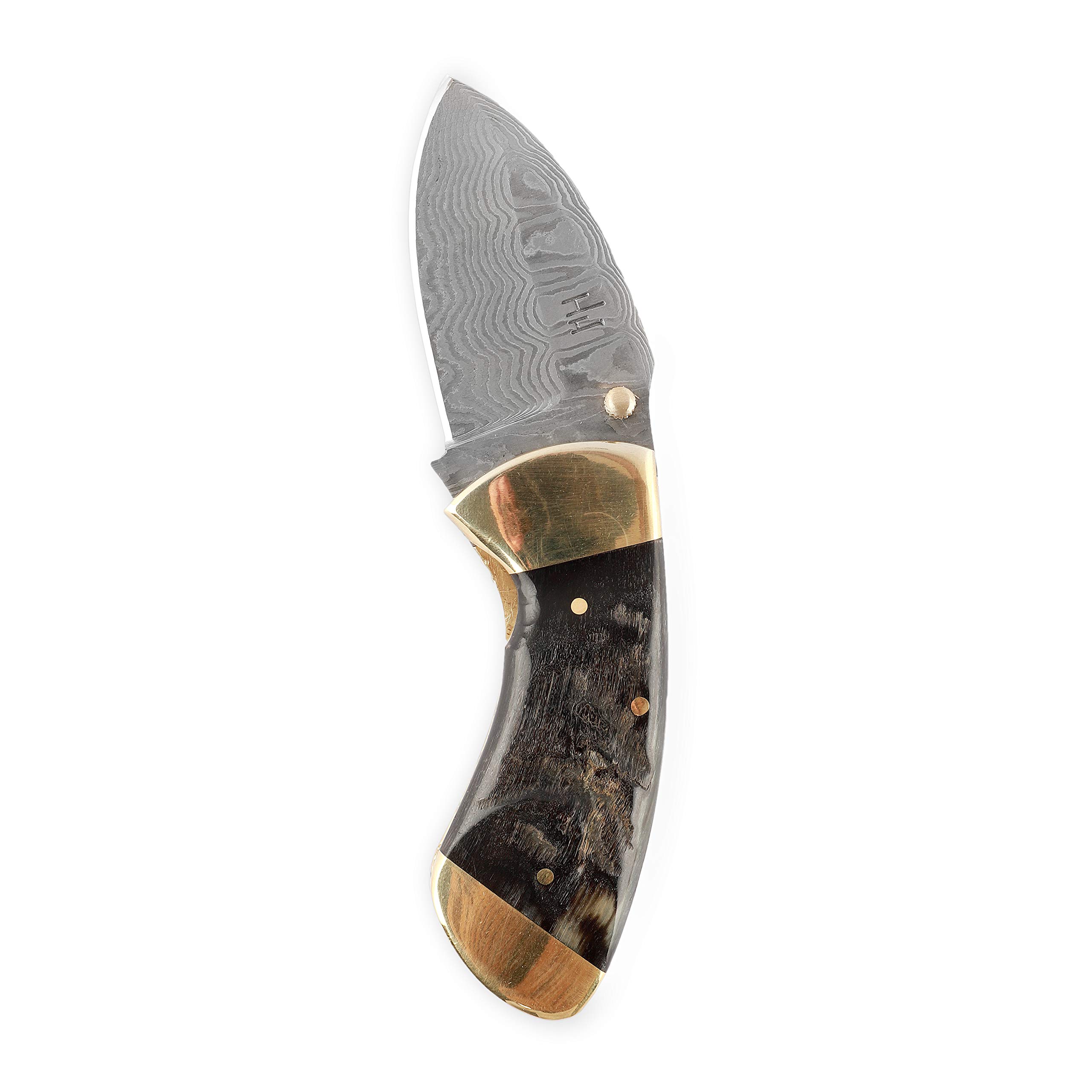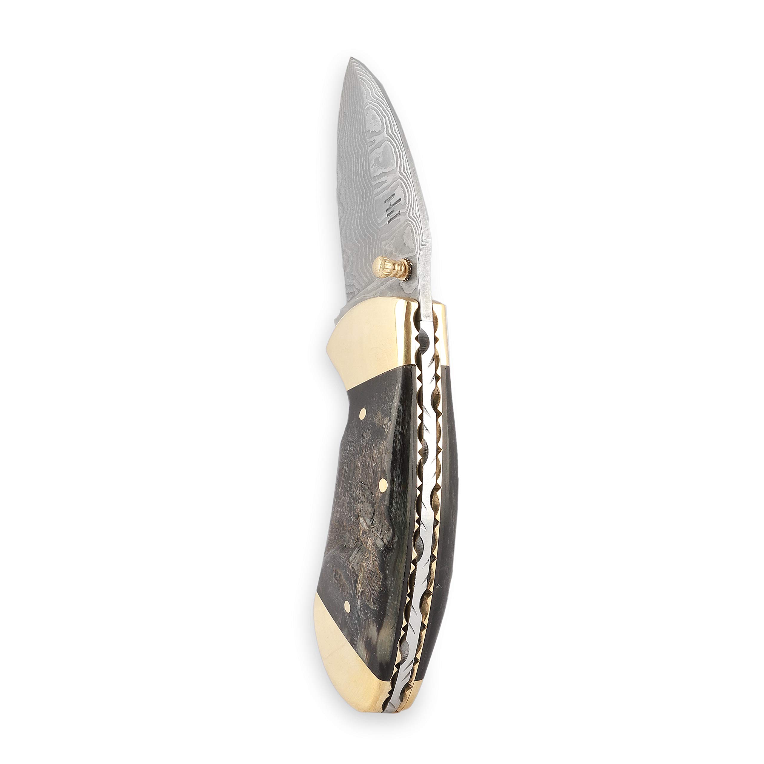 AUTHENTIC RAMS HORN HANDLE: Handcrafted 3.5-inch handle made from genuine rams horn with brass bolsters and decorative pins, providing a comfortable, secure grip and unique natural appearance