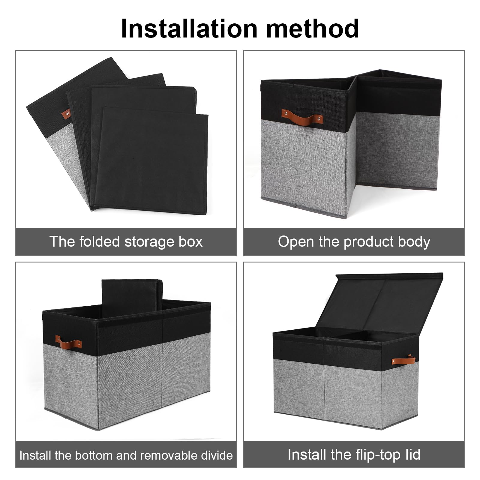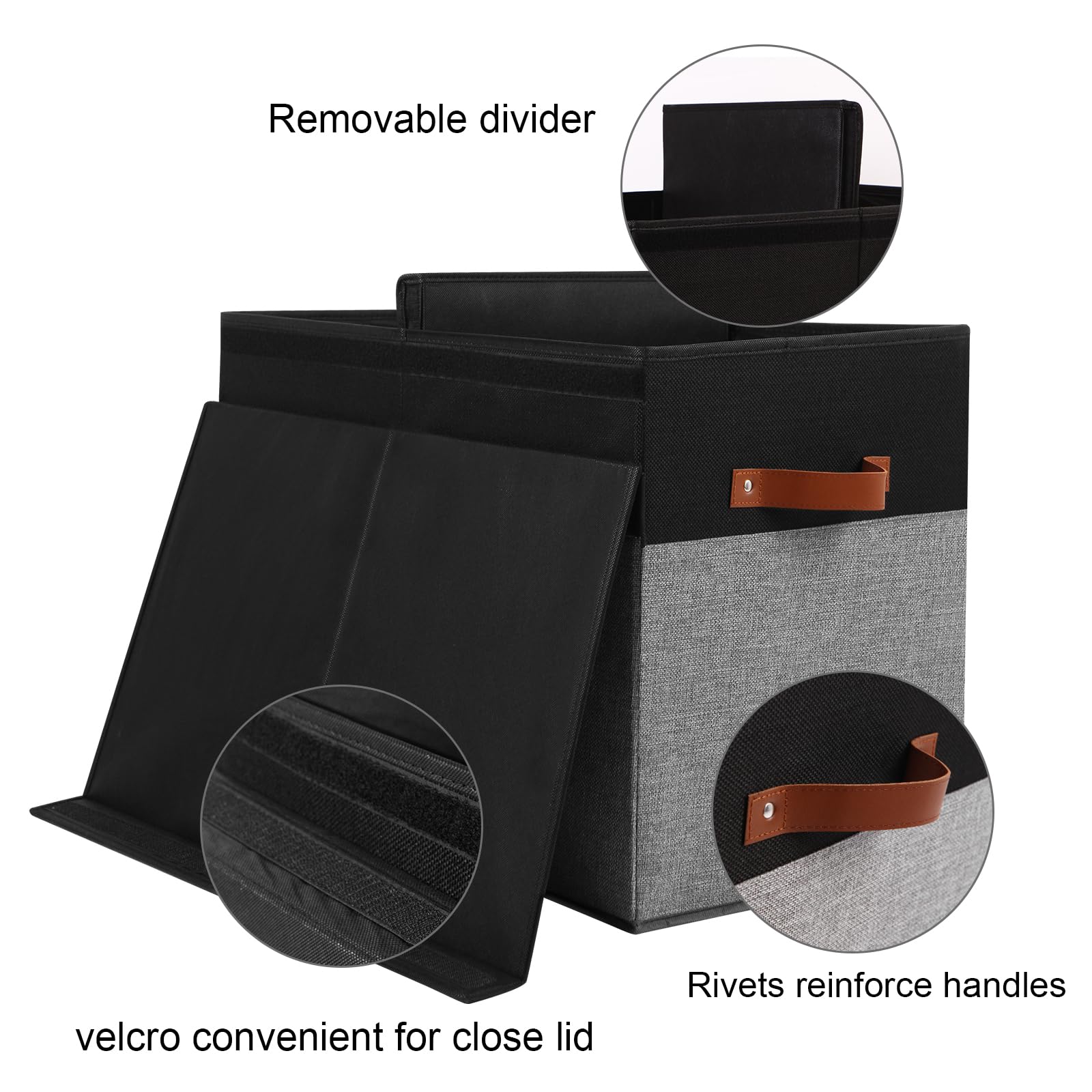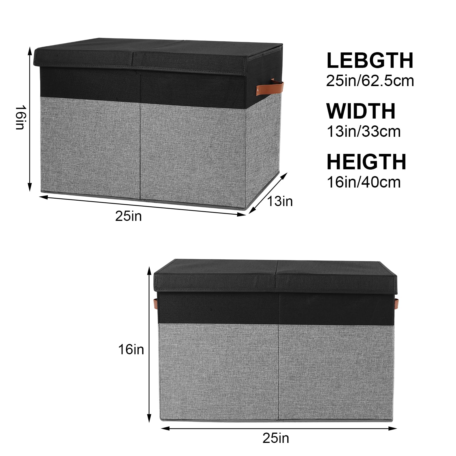 ADVANTAGES: Removable divider board : Great for organizing different items, you can detach the divider for store bigger things Flip-top lid : Keep your items away from dust, open the lid can also be used as an open box Rivets Reinforcement Handles : you can easily carry the large storage basket around your home Collapsible : When not in use, allowing you fold it flat, easy store or carrying Stackable : The toy boxes has a sturdy top, bottom and side, you can stack them SPECIFICATIONS: Color: Grey&Black External material: Polyester linen Upholstery Material: Non-woven fabric Construction Material: Environmentally cardboard Product Size: 25"x13" x16"(62.5 x 33 x 40 cm) MULTI-PURPOSES: Closet clothes storage Bathroom sundry storage Shelf organizers Car / vehicle grocery containers Nursery toy storage Bedroom comforters, blankets storage Kitchen & pantry snacks and dry foods storage Office document storage Laundry room cleaning supplies storage ABOUT OUR SERVICES If for any reason you're not completely happy with your purchase, please reach out and we will resolve issues and ensure your contentment.