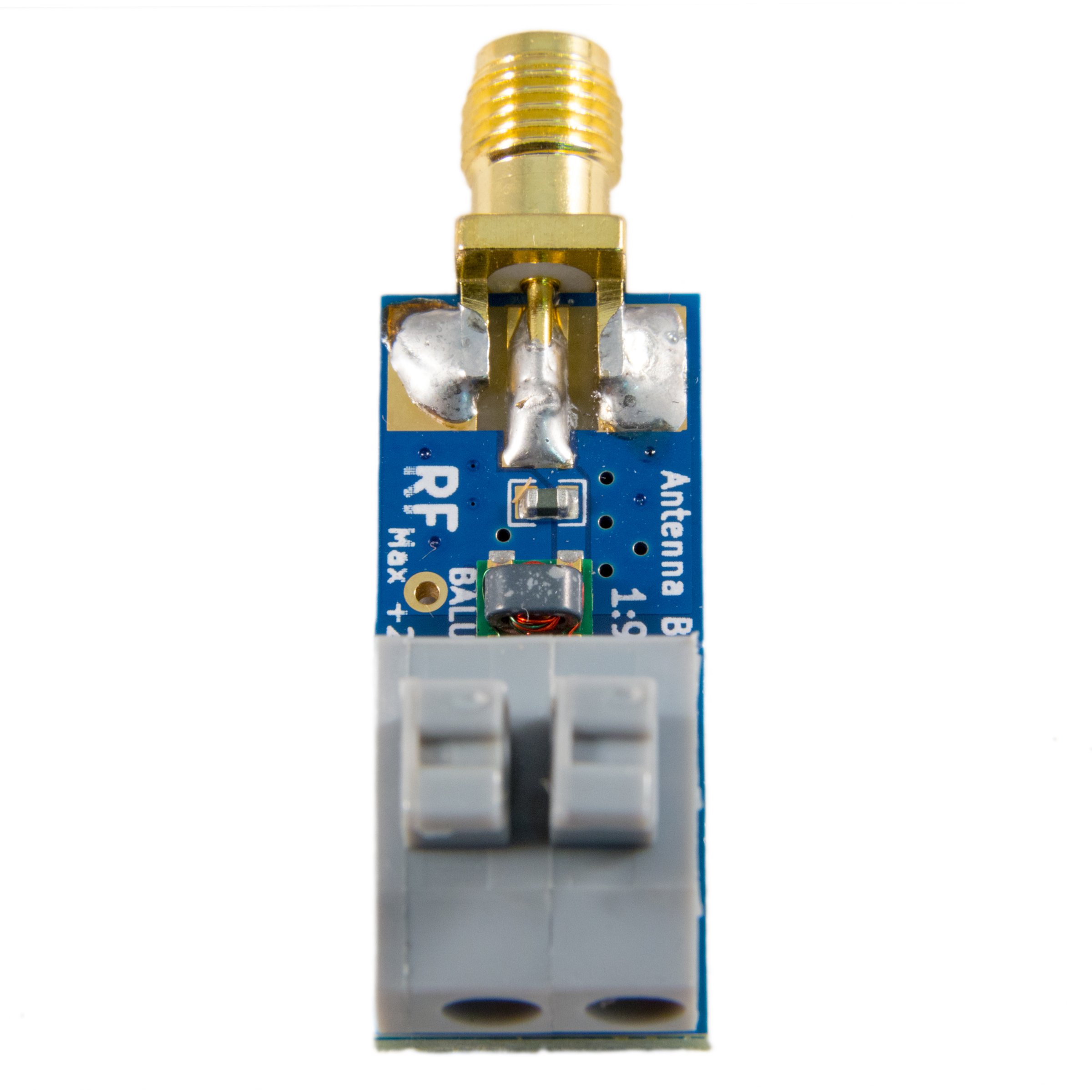 Meet 'Balun One Nine', a small, cost-effective balun. An excellent way to attach a long wire antenna to the Ham It Up, this 1:9 balun has an SMA output port and high-quality spring-type terminal block input for your coax. Balun One Nine includes an AntennaGuard varistor on the input, protecting your SDR setup from spurious ESD. The ESD protection is excellent--it passes IEC61000-4-2, an 8kV contact discharge test, with a response time of just 300ps. At 39.2mm x 13.0mm in total size (including connectors!) this balun was designed to be light in weight and light on your wallet. Very low insertion loss of -1.3dB (typical), with a maximum input power of 28dBm. Designed for HF applications, but specifications are accurate to frequencies up to 90MHz .