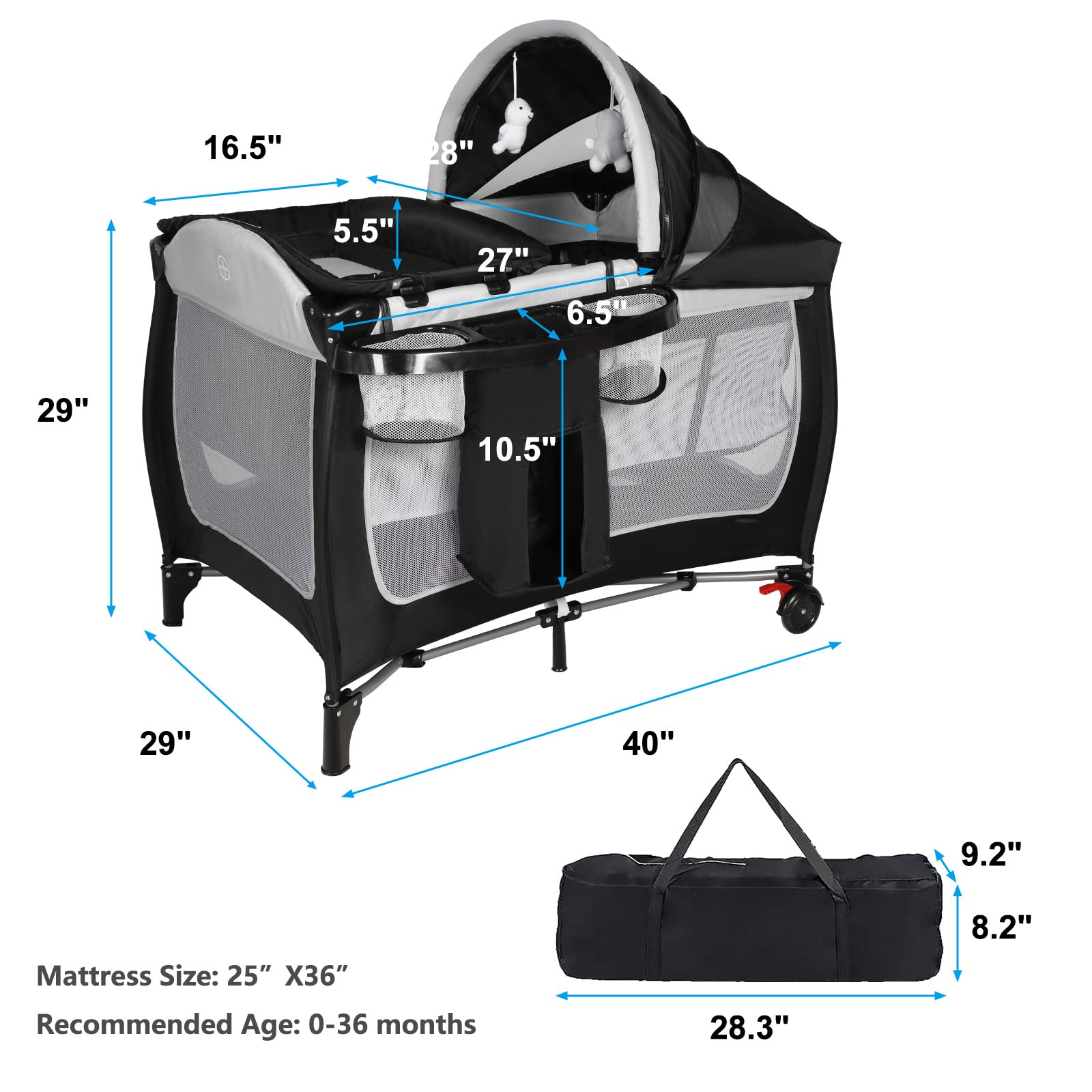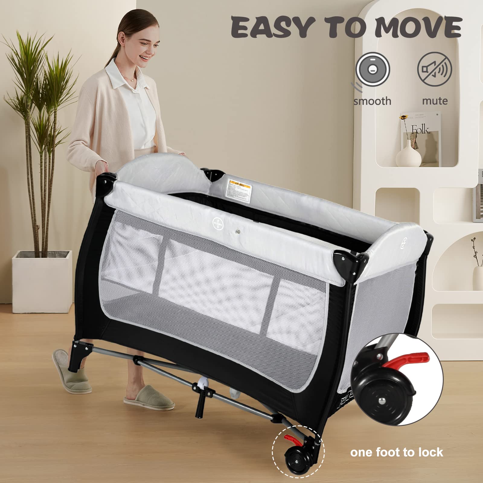 Portable Travel Design: Equipped with carry bag, suitable for family trips or visiting friend; Indoors and outdoors; The two wheels slide smoothly and quietly; The wheels can be locked with one click; The diaper organizer for daily necessities
