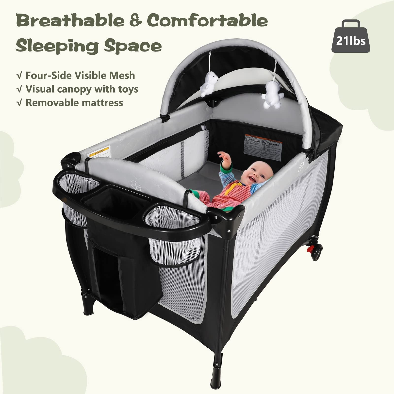 Fun & Spacious Space: Four side mesh design ensures air circulation and is convenient for parents to observe their baby; Oxford fabric is comfortable and breathable; Removable mattress; Adjustable canopy comes with cute rotating toys