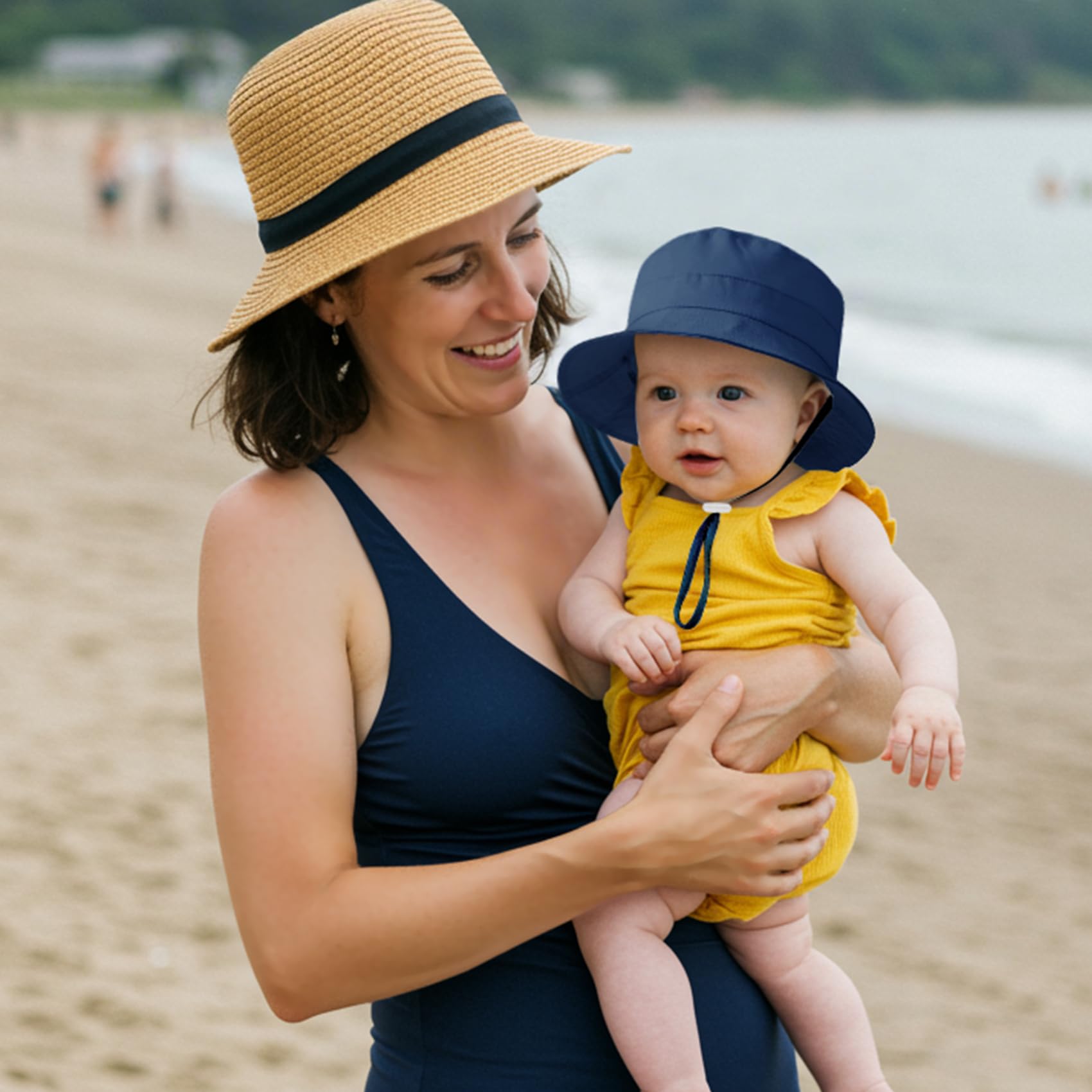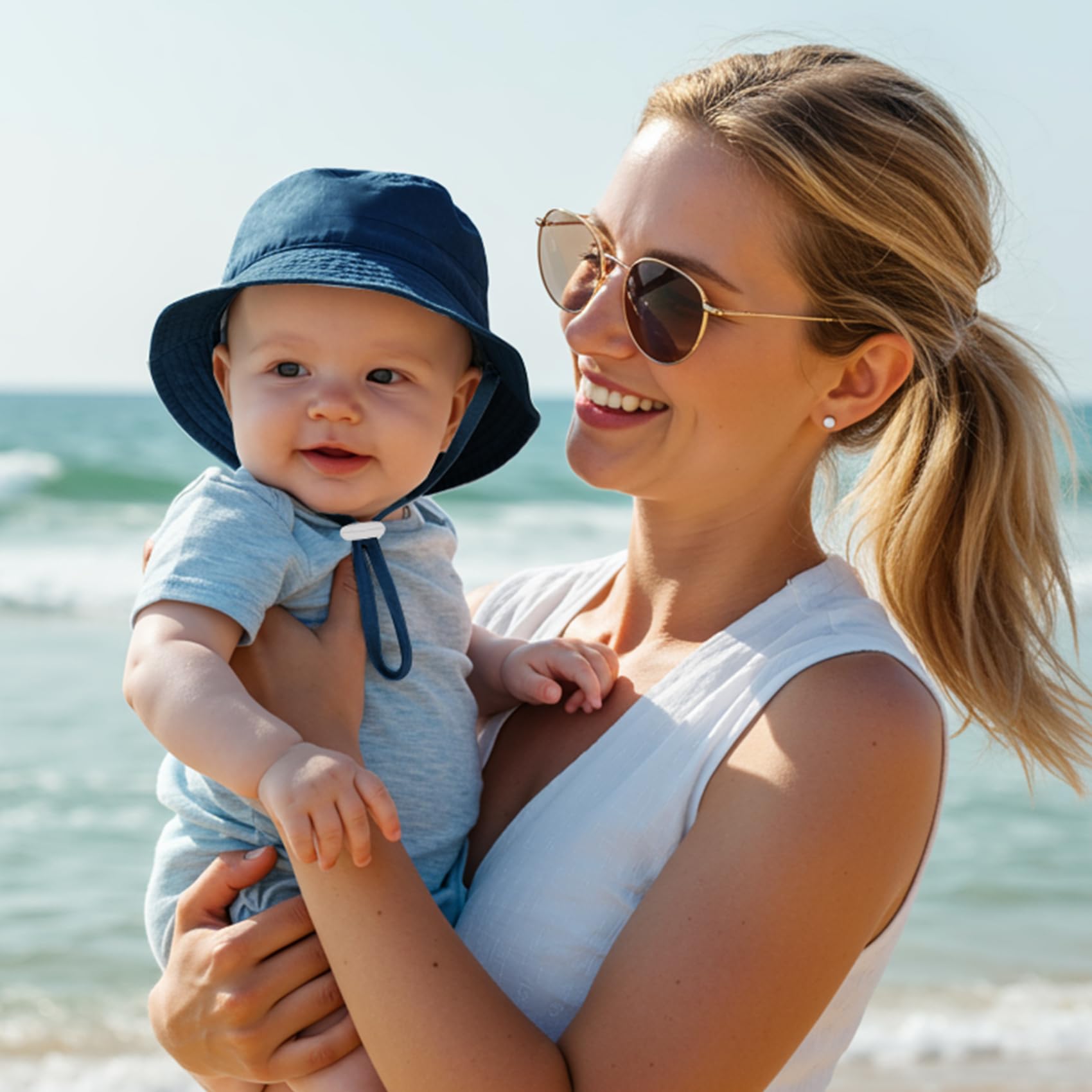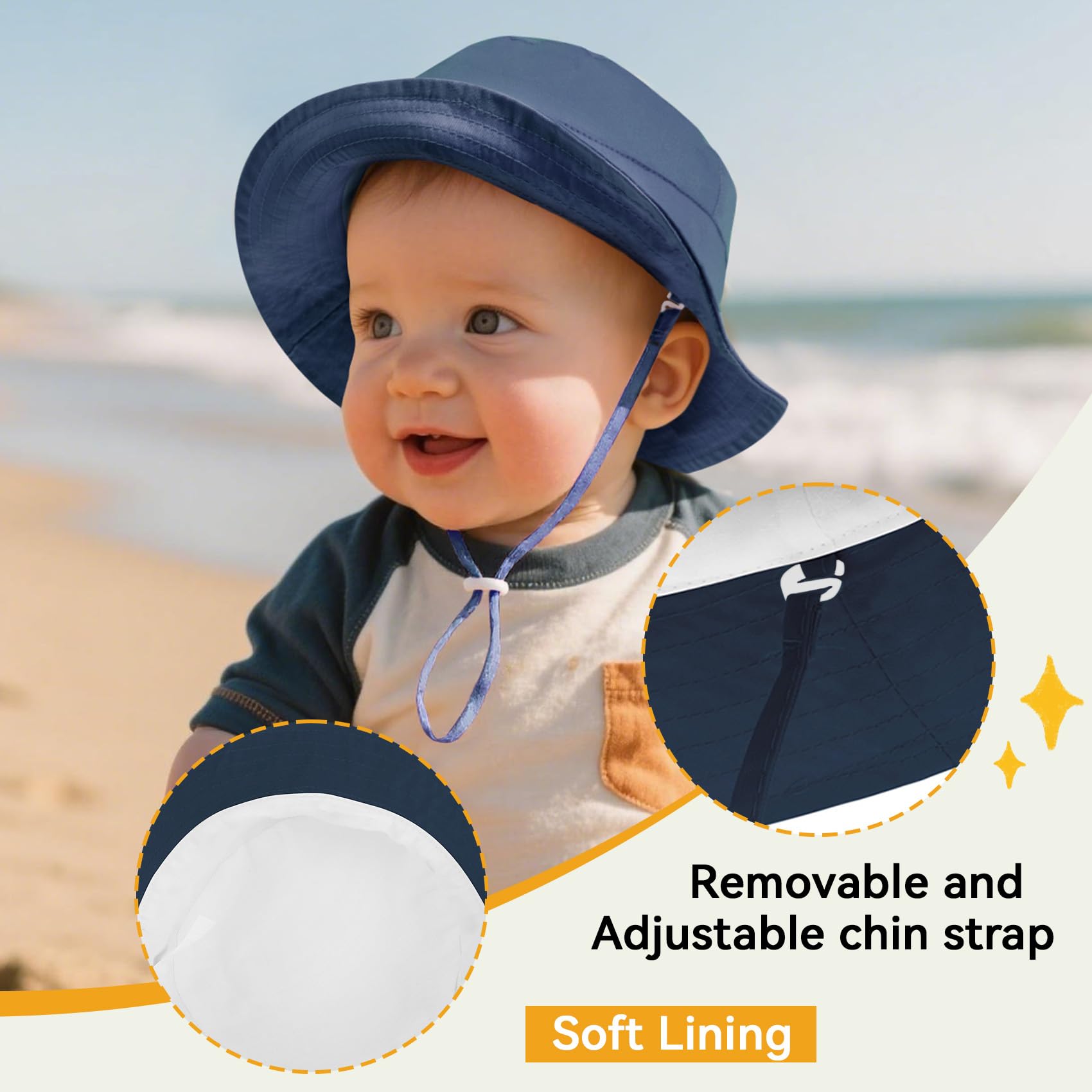 Adjustable:This baby bucket hat comes with an adjustable soft chin strap that can be adjusted to fit your baby's needs, and stays in place even in the breeze at the beach or while running around. Ensure comfortable and safe wearing