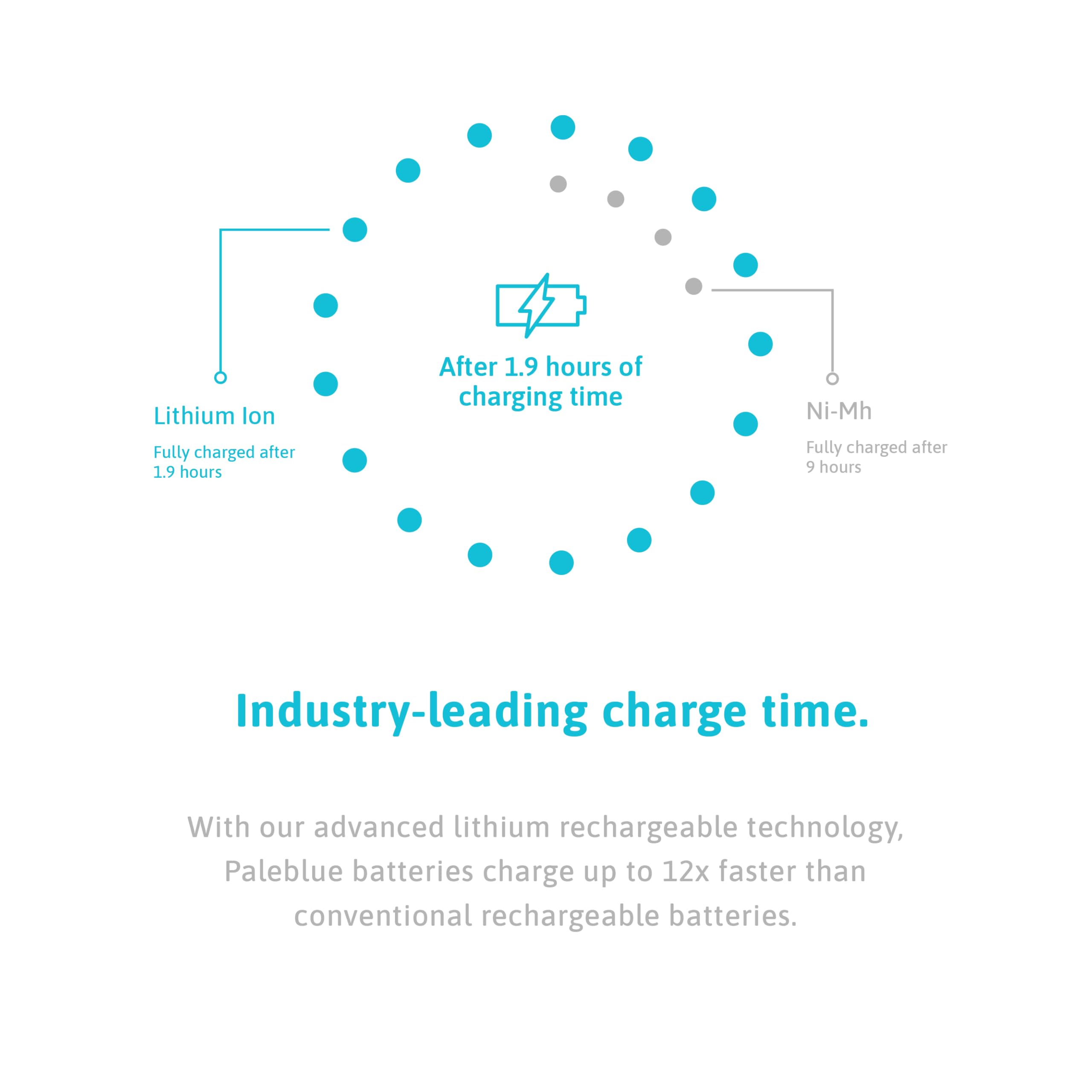 FAST CHARGE TIME: With our advanced lithium rechargeable technology, Paleblue batteries can charge up to 12x faster than conventional rechargeable batteries.