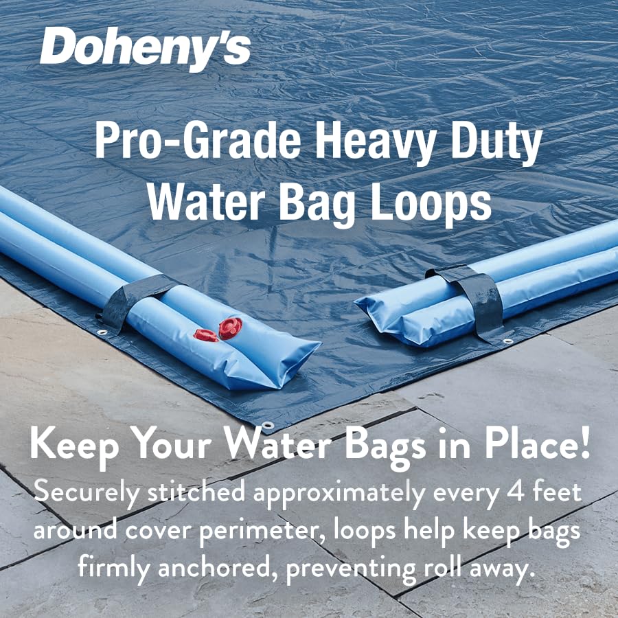 ALL COVERS COME COMPLETE WITH HEAVY-DUTY WATER BAG LOOPS (no water bags included) stitched approximately every 4 feet around the covers perimeter. Loops help keep bags firmly anchored preventing roll away.