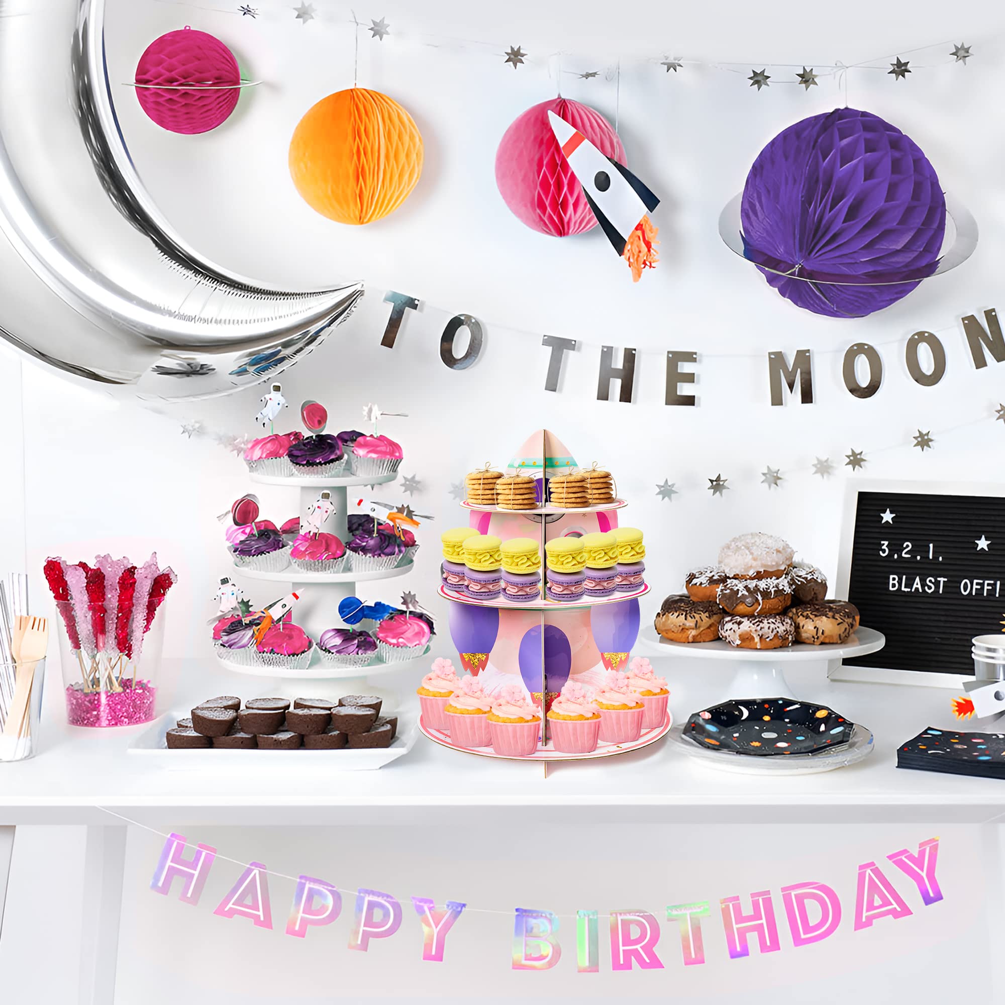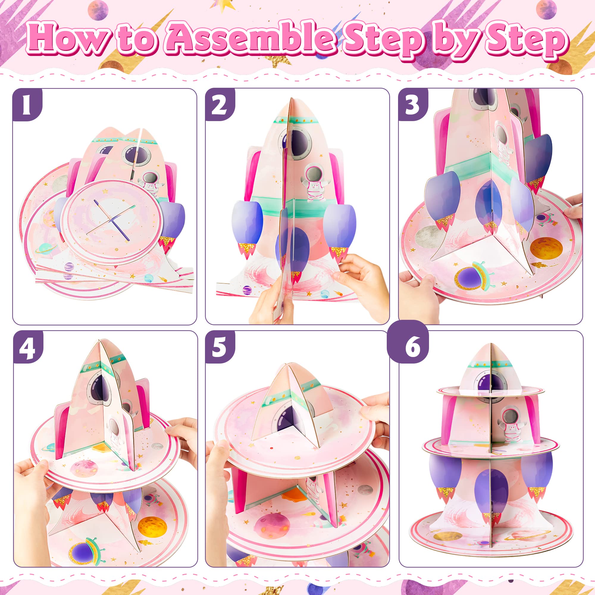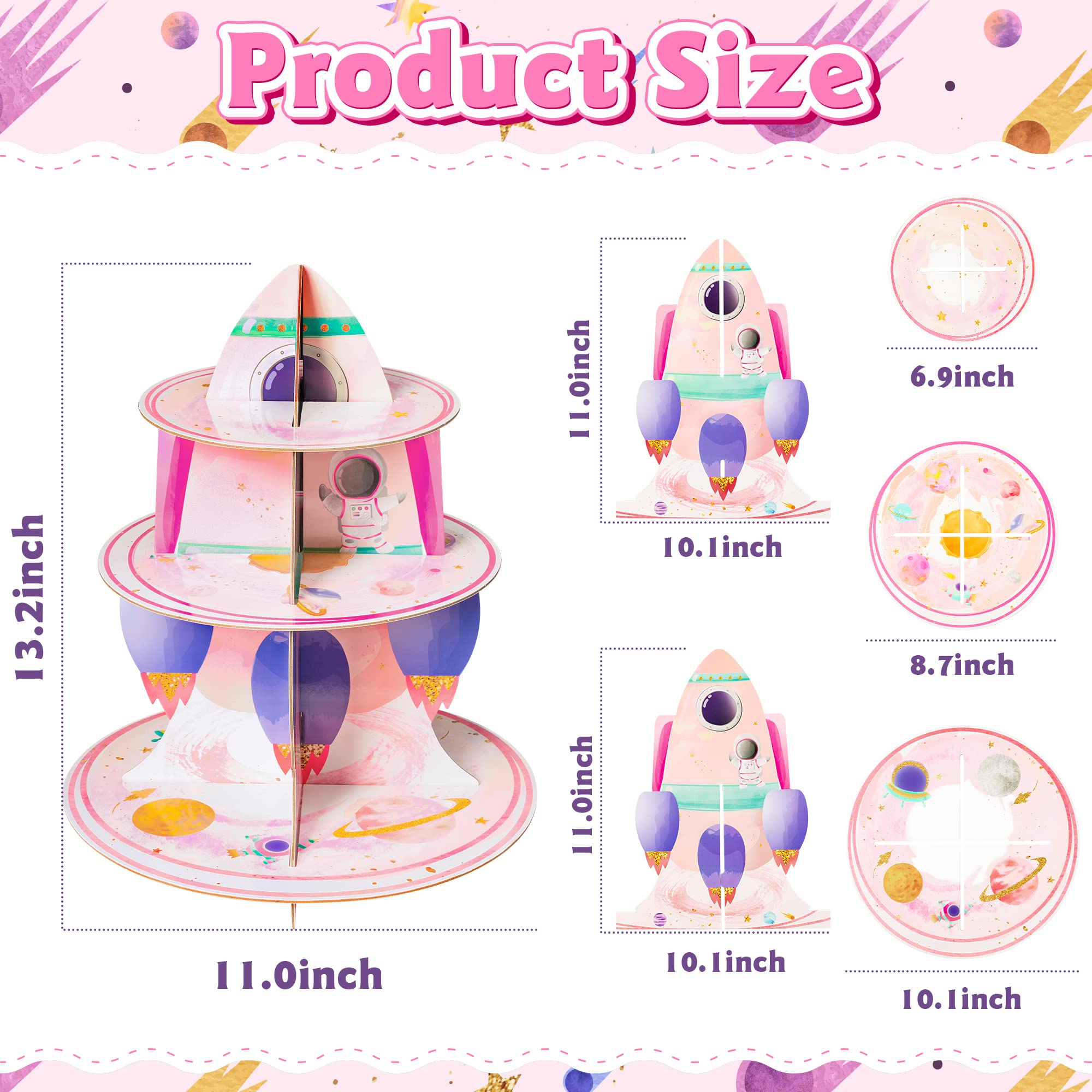 Space Themed Design: The pink watercolor space cake stand is designed with a space-themed pattern featuring rockets, planets, and other celestial objects. It is a unique and fun addition to any birthday party.