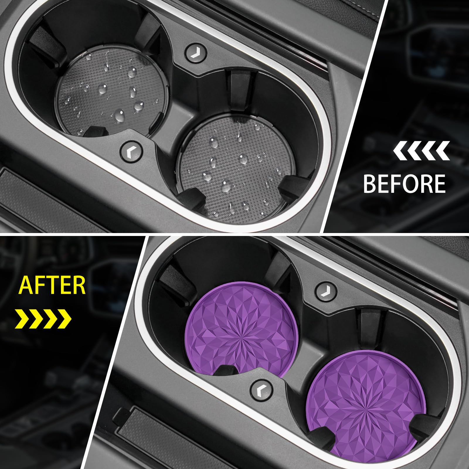 FIT MOST CAR CUP HOLDER SIZE: The thickening car cup coaster's thickness is 0.27'', the deep hem design can hold more overflow of water, juice and liquor from the cup. Diameter: 2.75'', which is suitable for most car cup holder applications. [ Please measure your car's cup slot size before purchasing, to avoid the size error to bring you trouble. ]