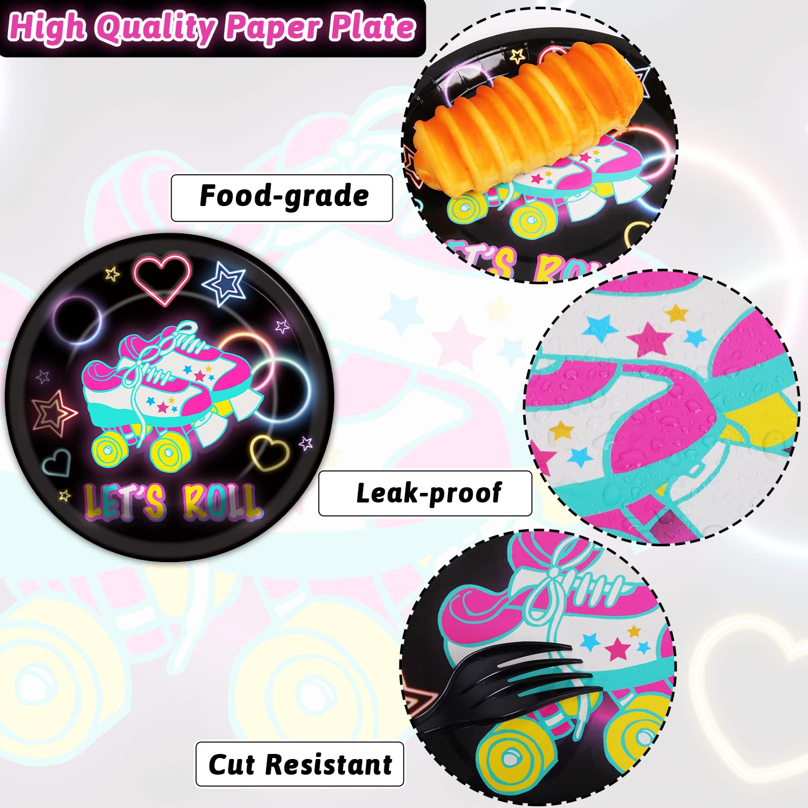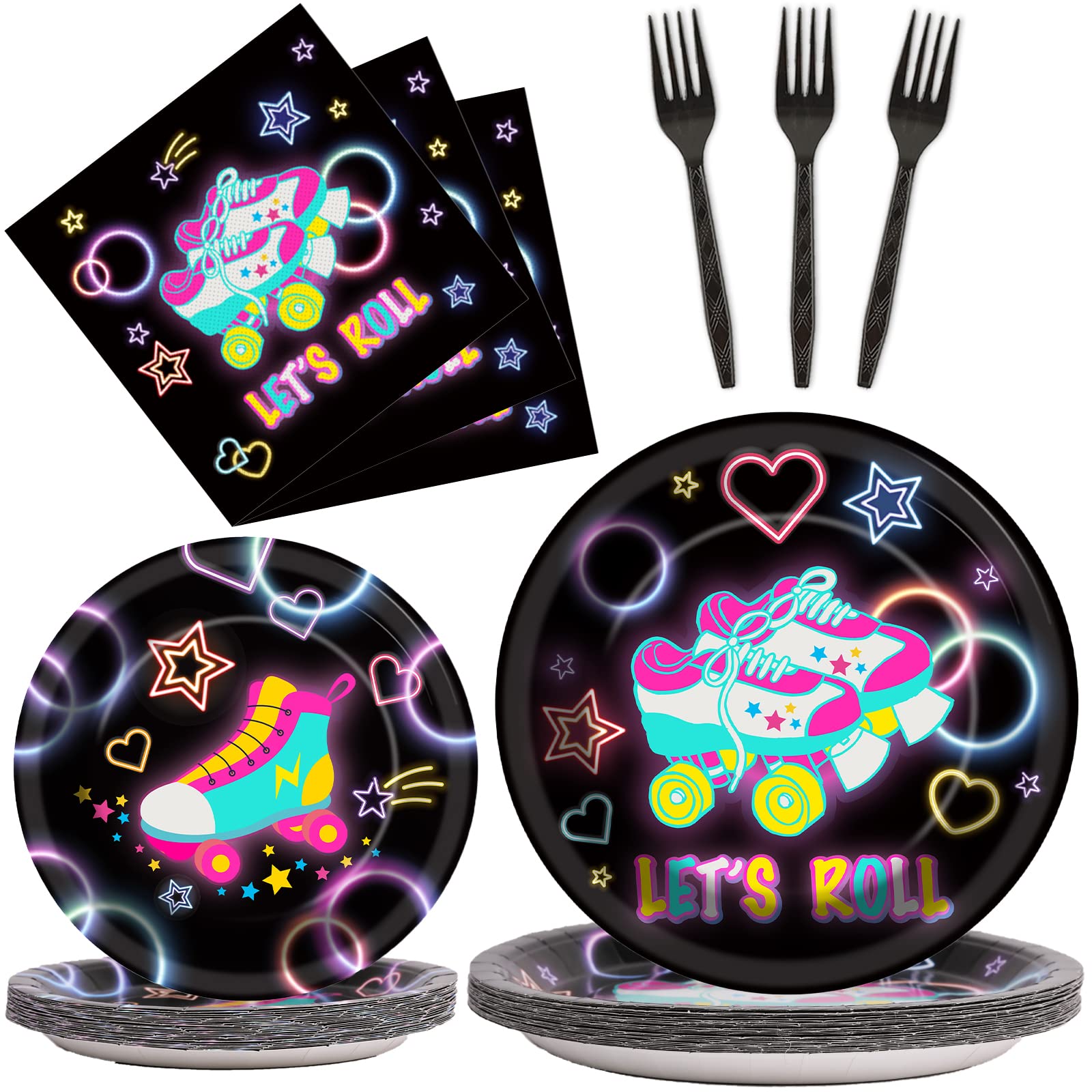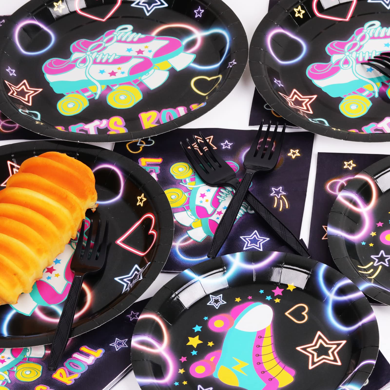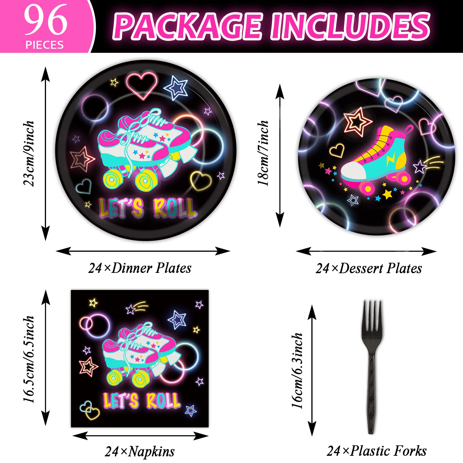 【Serves 24 Guests】Roller skating party supplies Included: 24pcs 9" dinner plates, 24pcs 7" dessert plates, 24pcs paper napkins, 24pcs forks that can serve 24 guests, enough quantity for a different and unique party!