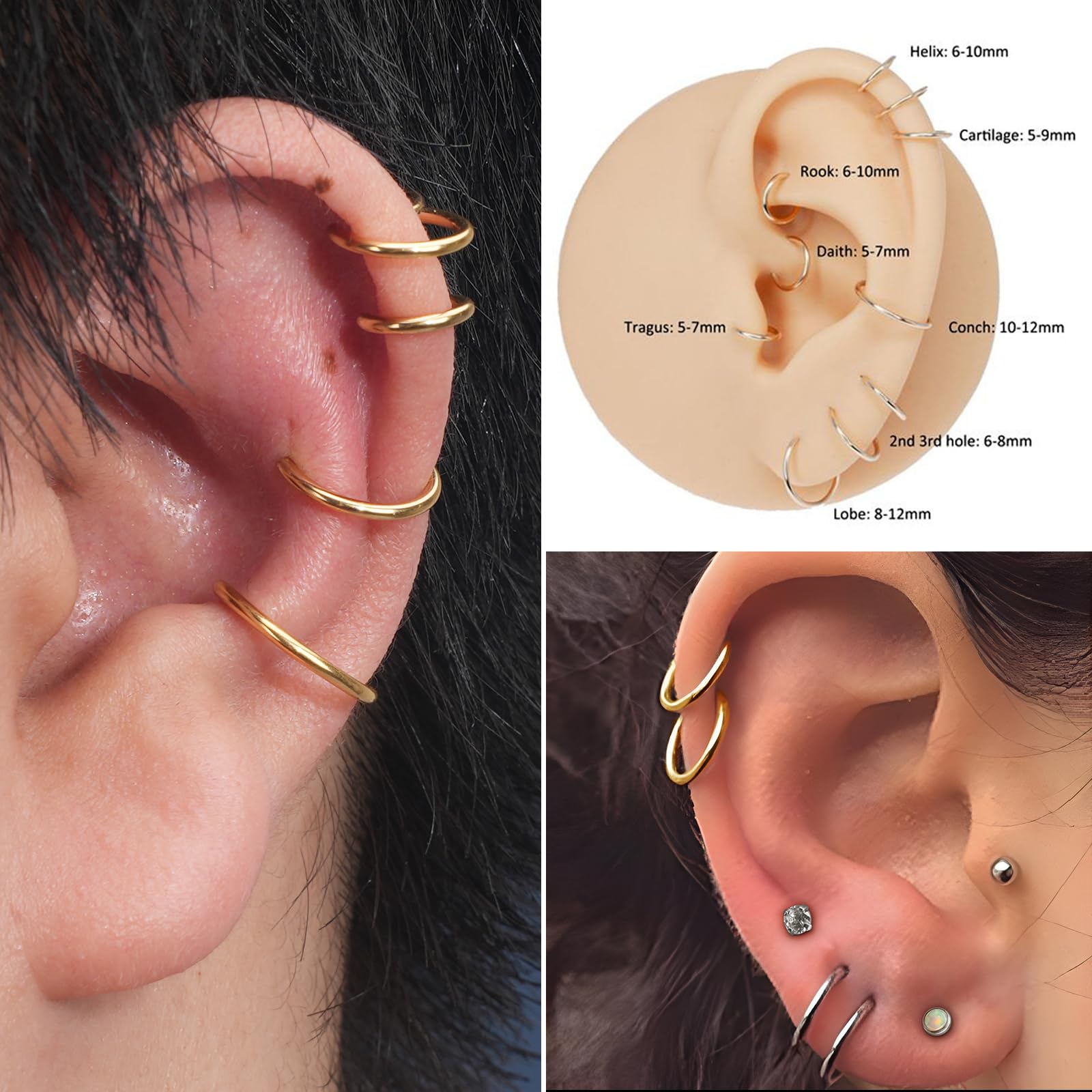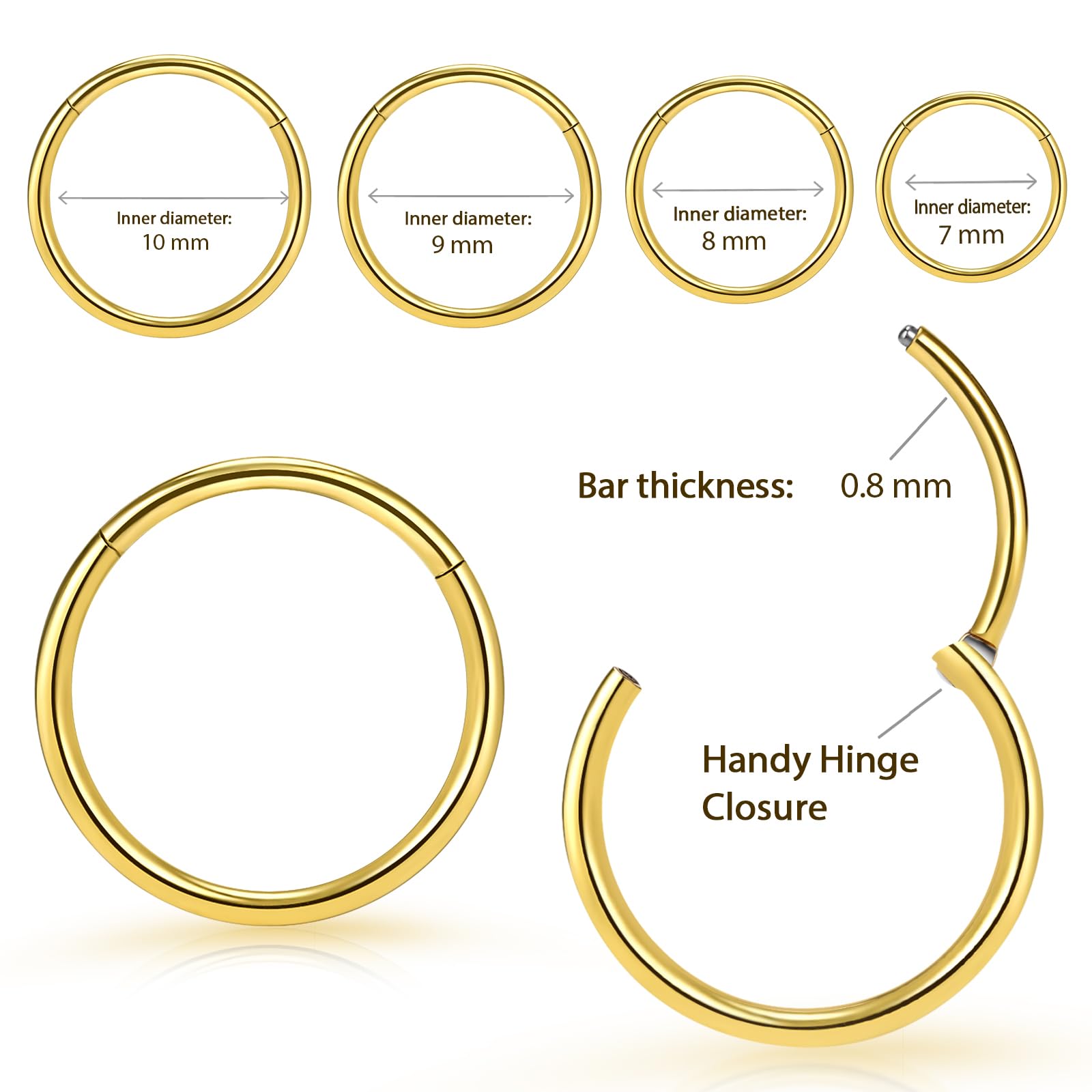 4Pcs 18K Gold Plated Nose Ring Piercings - This Septum Ring set Includes 4 pcs different Inner Diameter clicker (7mm 8mm 9mm 10mm), Theg is the size of the piercing hole: 20g (thickness: 0.8mm). Whether at the ear, the nose or the lip - our clickers are suitable for a variety of different piercing locations. Please check the size chart to choose yourg and diameter hoop for your nose piercing or ear piercing needs.