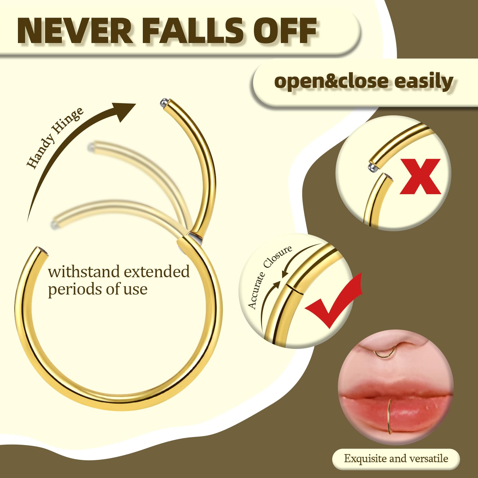 20g Hinged Clicker Seamless Hoops - These hinged nose rings adopts a seamless design. 18K gold plated finish and highly polished that nice and smooth and stay closed perfectly. Easy to open and close the click closure by hand, you can sleep, work and have a shower with it in because the snaps closed well and won't fall out. And it won't fall out in the shower.