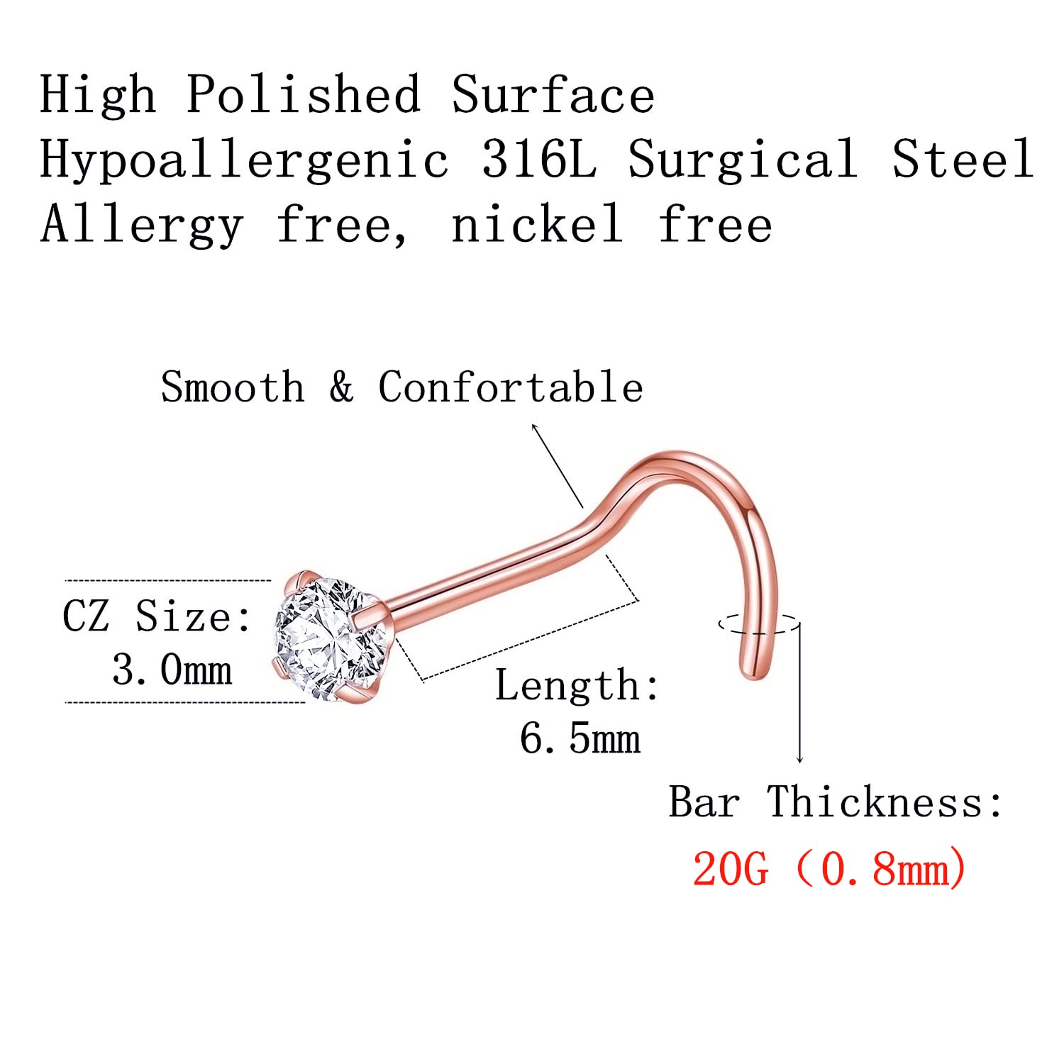 Quantity: 6pcs 3.0mm CZ screw nose rings. This screw nose ring size: Bar thickness: 20 gauge (0.8mm), Pin Length:6.5mm, Prong set cubic zirconia: 3.0mm, These stones a very bright and prong set by hand for accuracy.