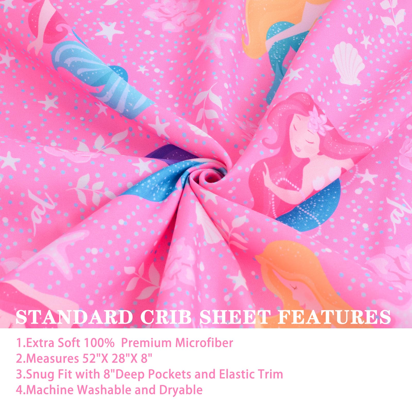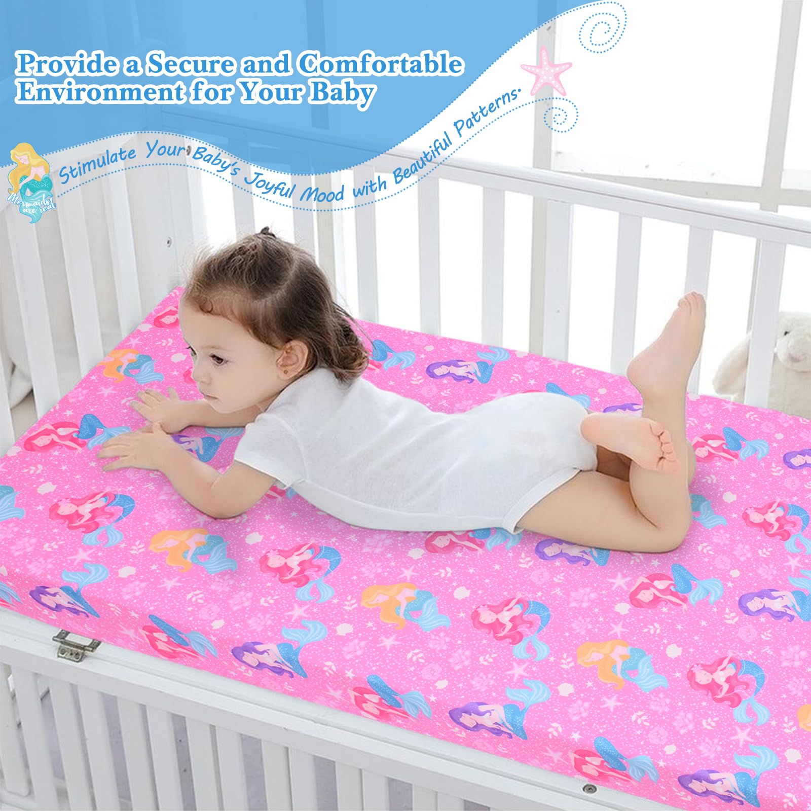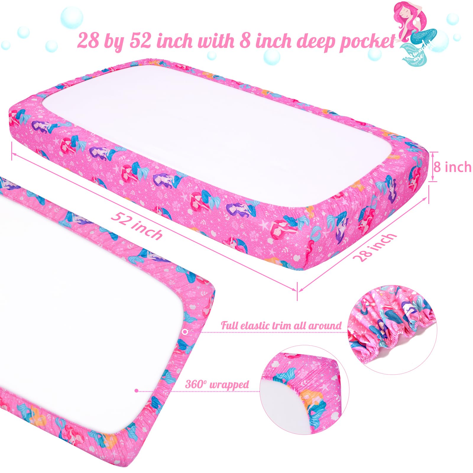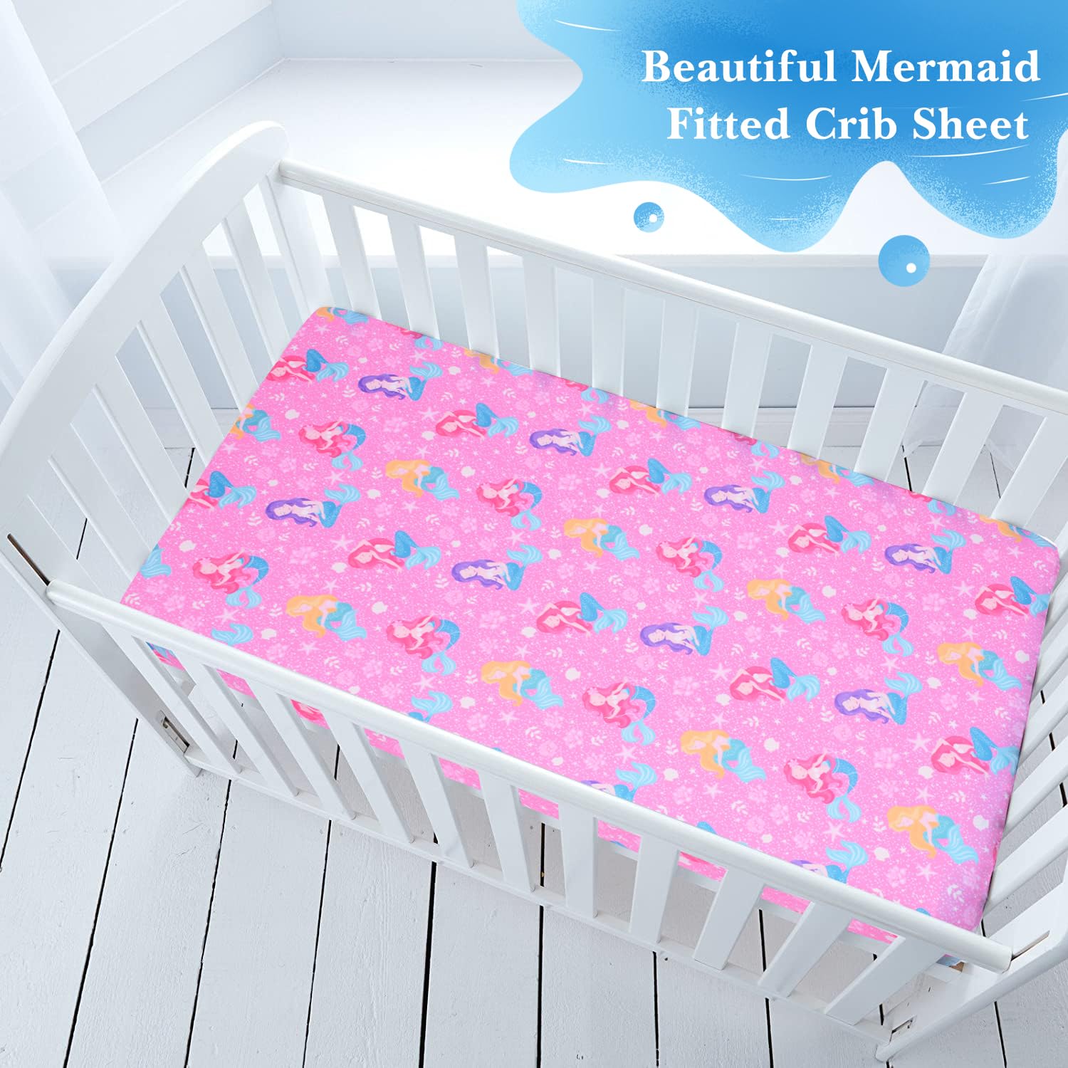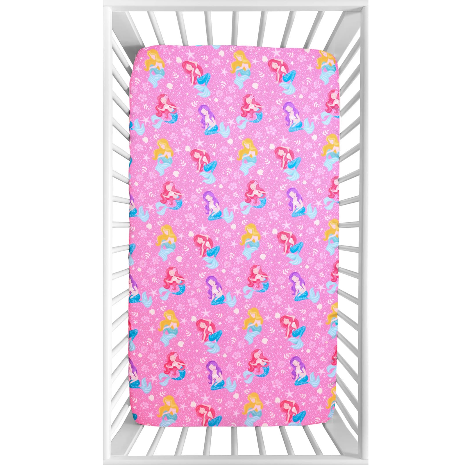 Enchanting Mermaid Nursery Decor: Adorned with whimsical mermaids on a soft pink background, this sheet transforms your crib into a magical underwater world. The matching pillowcase completes the dreamy look!
