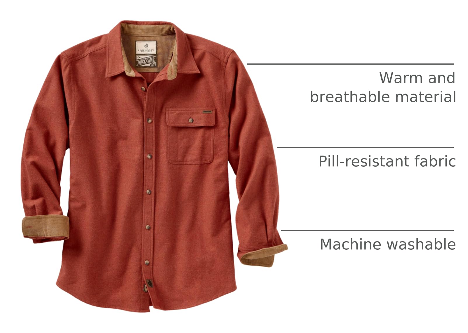 Description Our original single pocket flannel - The Buck Camp Flannel Shirt is the perfect weight to wear alone or layered over a t-shirt or under a shirt jacket. The traditional style and signature corduroy details offer unmatched durability, while the relaxed fit and brushed cotton flannel provide ultimate comfort. With multiple exclusive plaids and solids, they're suitable for any occasion from the woods to the office. The Buck Camp Flannel Shirt gives you an incredible "bang for your buck"! Big & Tall sizes are designed for men over 6'2" and add 2" in body length and 1-1⁄2" in sleeve length.