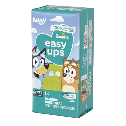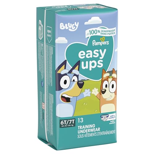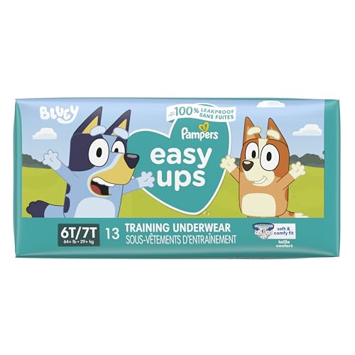 Start your potty training journey with Pampers Easy Ups Potty Training Underwear for Girls and Boys! Featuring your favorite characters – Bluey and My Little Pony - these super soft, comfortable, and breathable training pants fit just like real cotton underwear allowing your toddler to feel like they have transitioned out of diapers! With a 360 stretchy waistband that is gentle on your child's skin, Easy Ups make it easy for your toddler to pull up and down their training pants independently. For easy changing, Easy Ups feature easy tear sides for convenience, even on the go! When it comes to potty accidents, your toddler will be covered with up to 100% leakproof protection Day OR Night. To protect where leaks happen most, Easy Ups are made with Dual Leak-Guard Barriers around the leg cuffs and Extra Absorb Channels for all around coverage to absorb accidents and lock them away from your toddler's skin. Plus, they're dermatologically tested, hypoallergenic, and free of parabens and latex.* That's just one of the many reasons Pampers is the #1 pediatrician recommended brand. Toilet training is a journey and can take your toddler 90 days on average to catch on. So, Pampers Easy Ups makes it easy with each box containing a one-month supply of training pants. Available in sizes 2T-3T (16-34 lb), 3T-4T (30-40 lb), 4T-5T (37 lb and up), 5T- 6T (41 lb and up) and 6T-7T (64 lb and up).*Natural Rubber