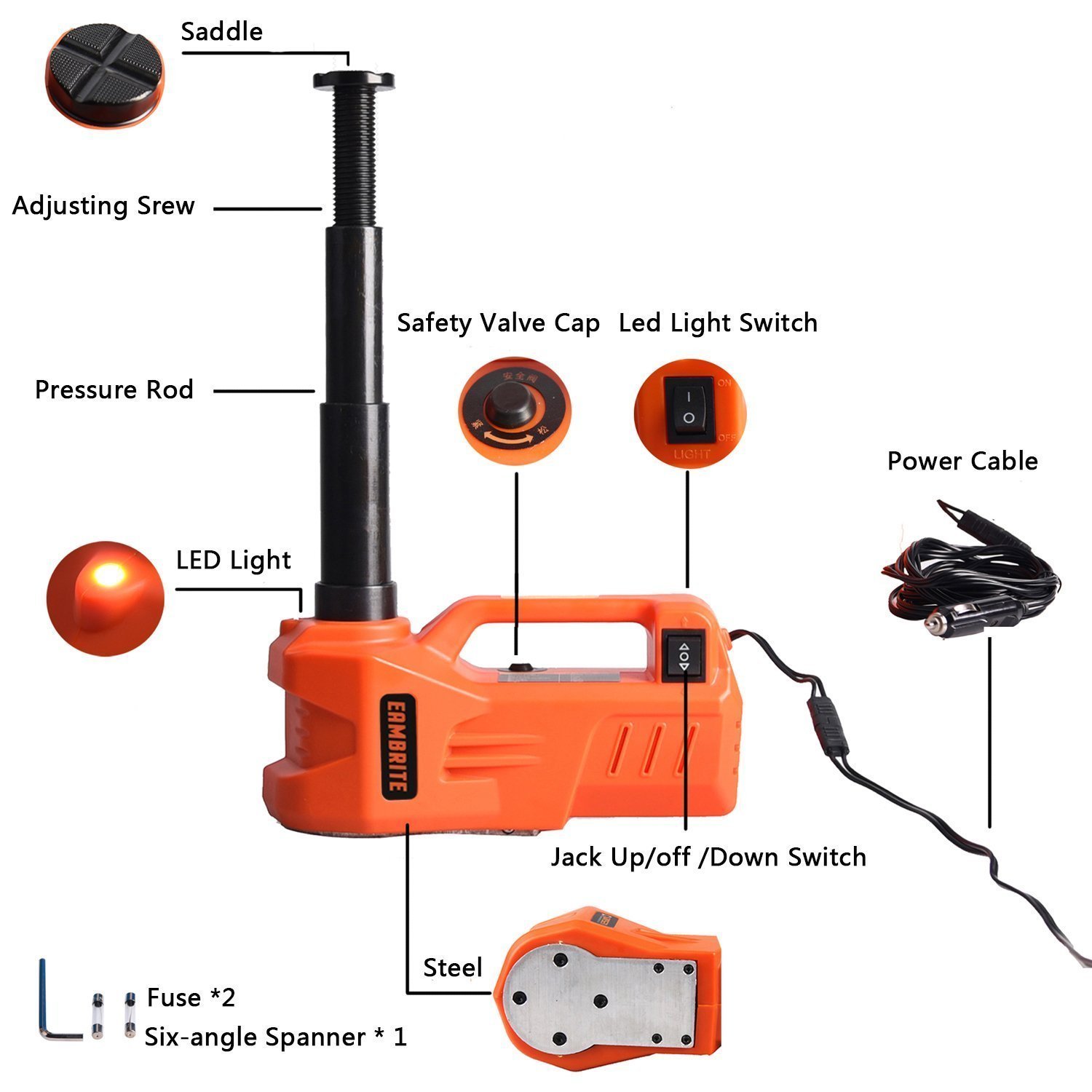 Easy to Operate: Only 2 switches on the panel to operate---a vertical lift control switch and a LED light switch. Press lift control switch to make the electric jack lift up and down. Build-in flashlight helps you see more clearly under the car
